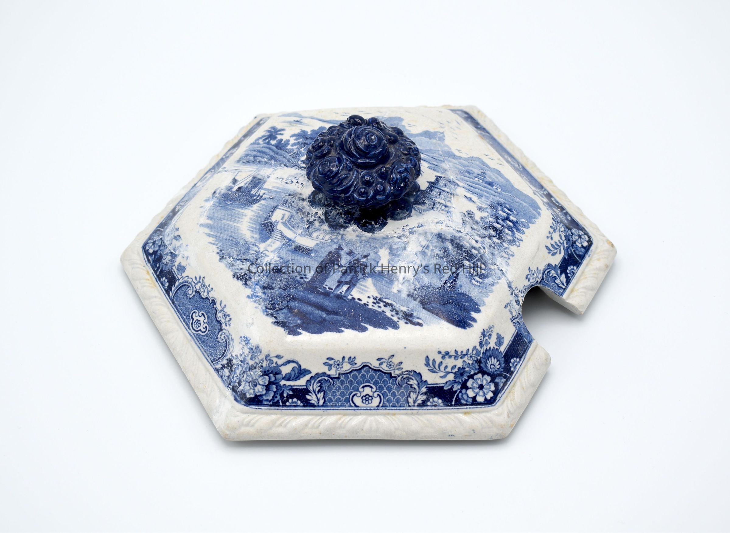 This Staffordshire "India Temple" soup tureen lid belonged originally to Edward Winston Henry Sr. (1794–1872), a son of Patrick Henry. Edward Winston Henry Sr. jointly inherited Red Hill with his brother John Henry (1796–1868). John Henry took over the original plantation, while Edward Winston Henry Sr. took the east side of the property and built a house called Windstone. His descendants lived on this property for many years.