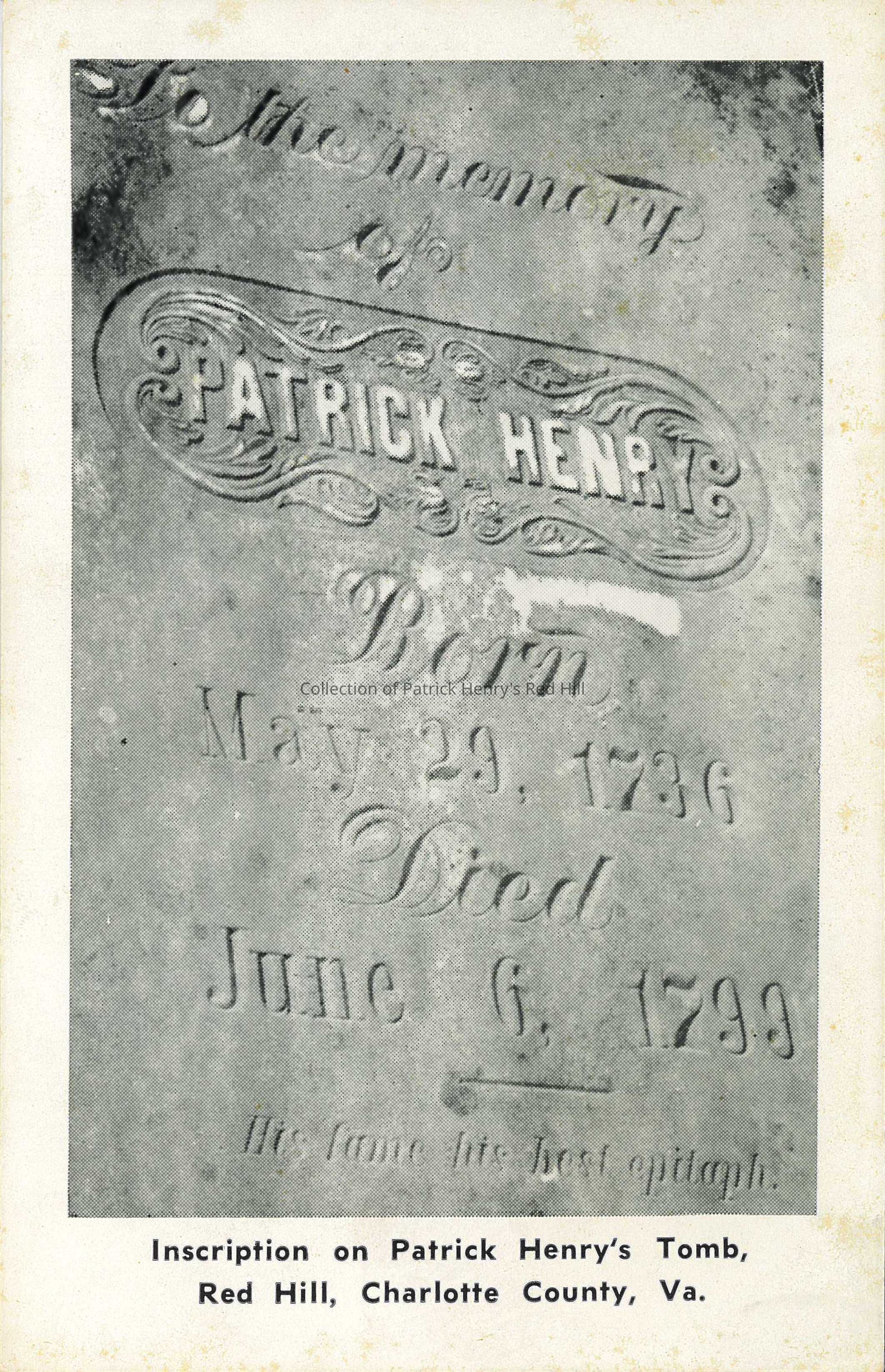 Typed under photo on obverse: "Inscription on Patrick Henry's Tomb, Red Hill, Charlotte County, Va."Postcard Details