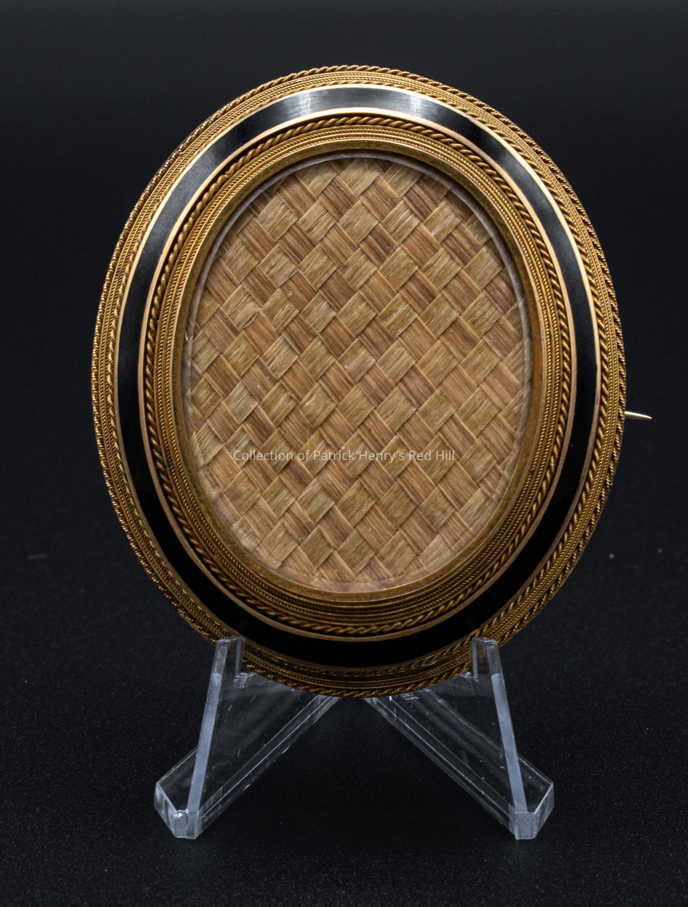 This brooch is part of a set, along with two earrings (76.14.2-3). It includes the hair of John Henry (1796–1868), the youngest son of Patrick Henry, who died at Red Hill on January 7, 1868, and was commissioned in his memory. John's wife, Elvira McClelland (1808–1875), likely wore these items. Although John had brown hair in life, over time, these cuttings have lightened significantly due to oxidation.