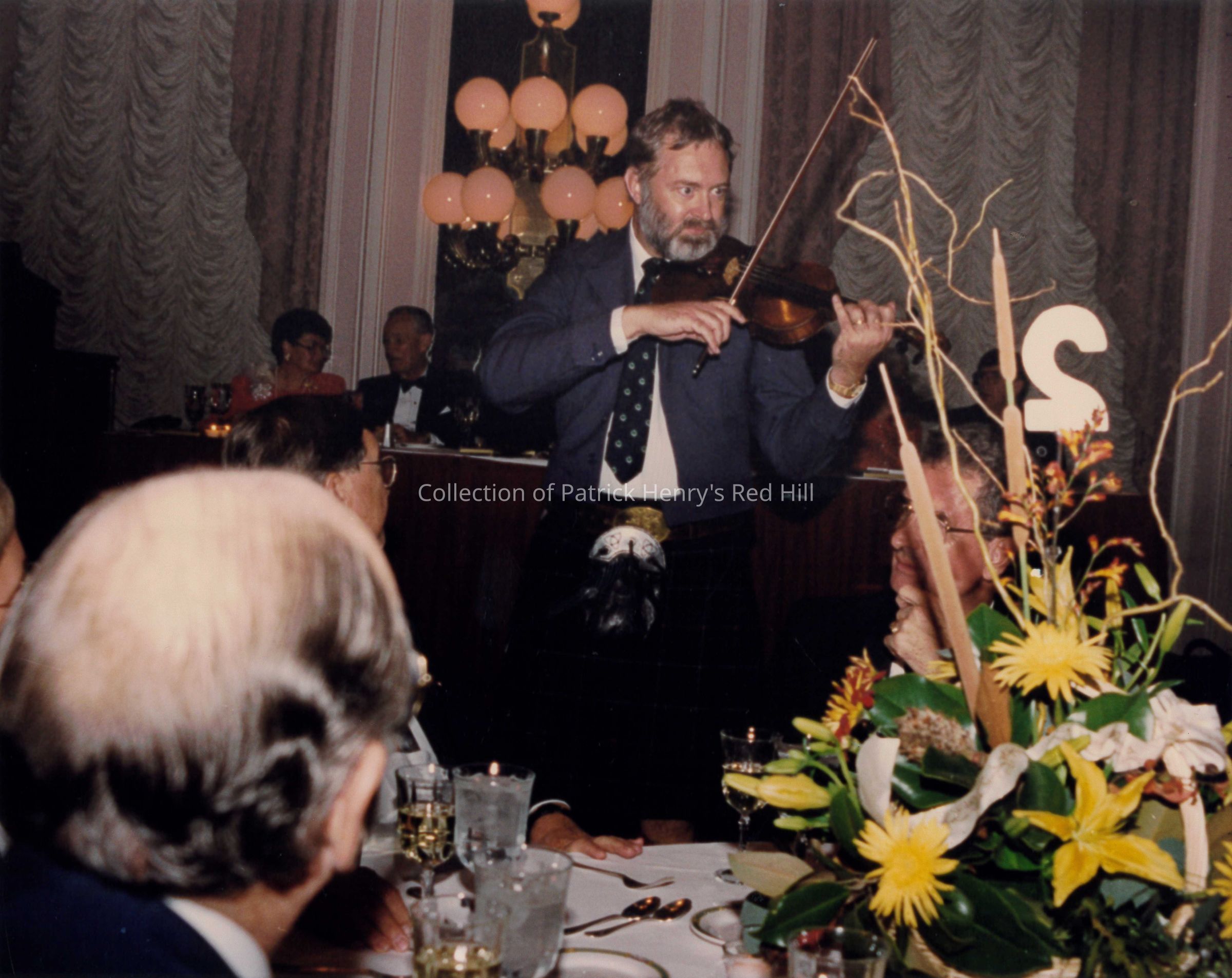 John R. Turner, who is pictured playing the fiddle for guests, also played the bagpipes (see 2024.6.5) which was listed on the event program as "Processional from Rotunda to the Ball Room." PHMF's then president, Carolyn M. Lusardi (1919–2009), gave the "Recognition of Distinguished Guests" and shared "Remembrances of Fifty Years." Mills E. Godwin Jr. (1914–1999) served as governor of Virginia for two non-consecutive terms, from 1966-1970 and from 1974-1978.