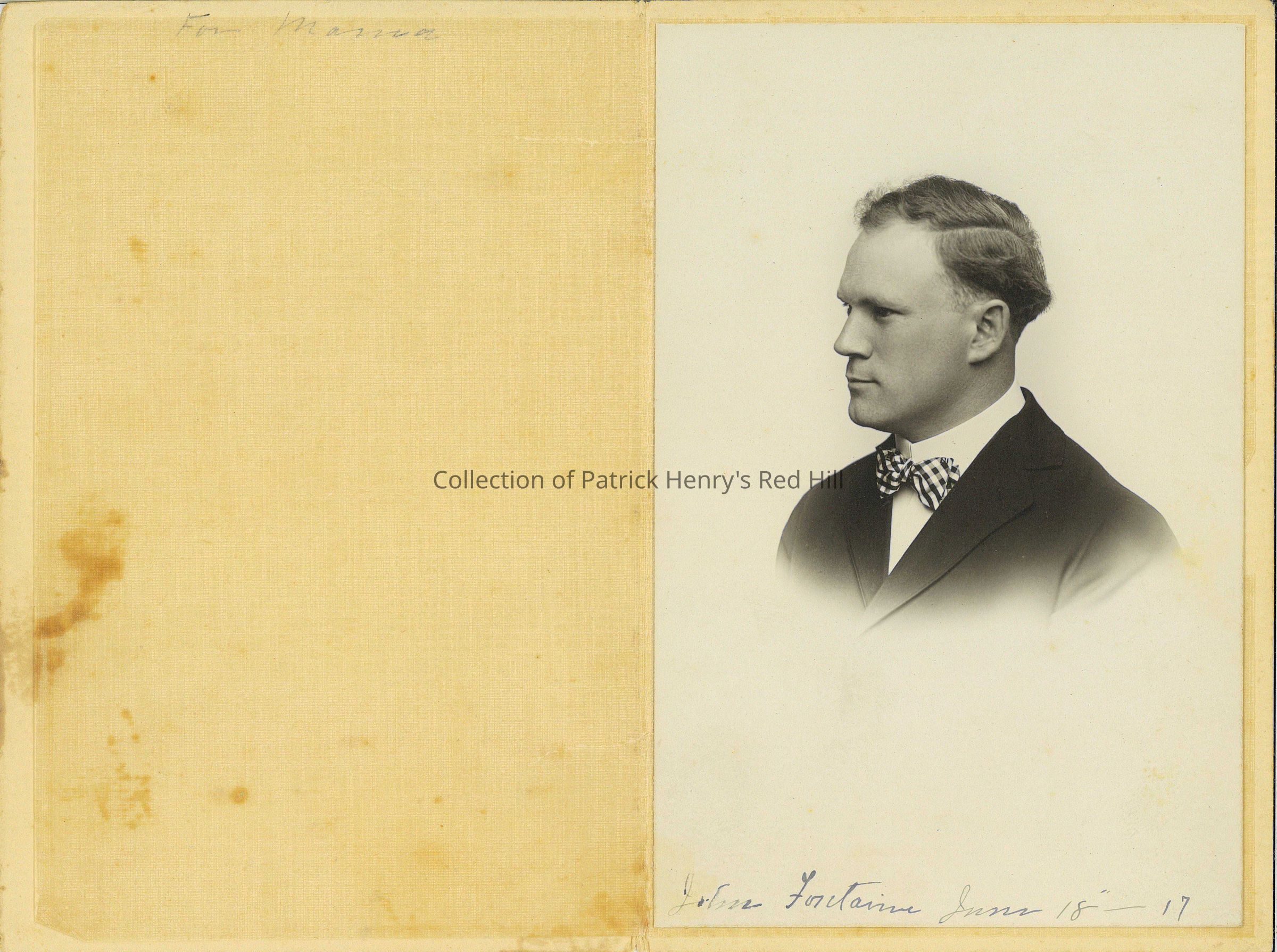 John Winston Fontaine, a great-great grandson of Patrick Henry, was born on January 27, 1887, to Rev. Patrick Henry Fontaine (1841-1915) and Annie Elizabeth Redd (1847-1936) at "Elmo" in Halifax County, Virginia. He was 30 years old at the time of this photograph, which was given to his mother. He never married and did not have children. John was a professor of music who taught at several colleges, including Atlantic Christian College (later Atlantic University) in Wilson, North Carolina. He died on August 21, 1973, and was buried with his parents in Amis Chapel Cemetery in Granville County, North Carolina.