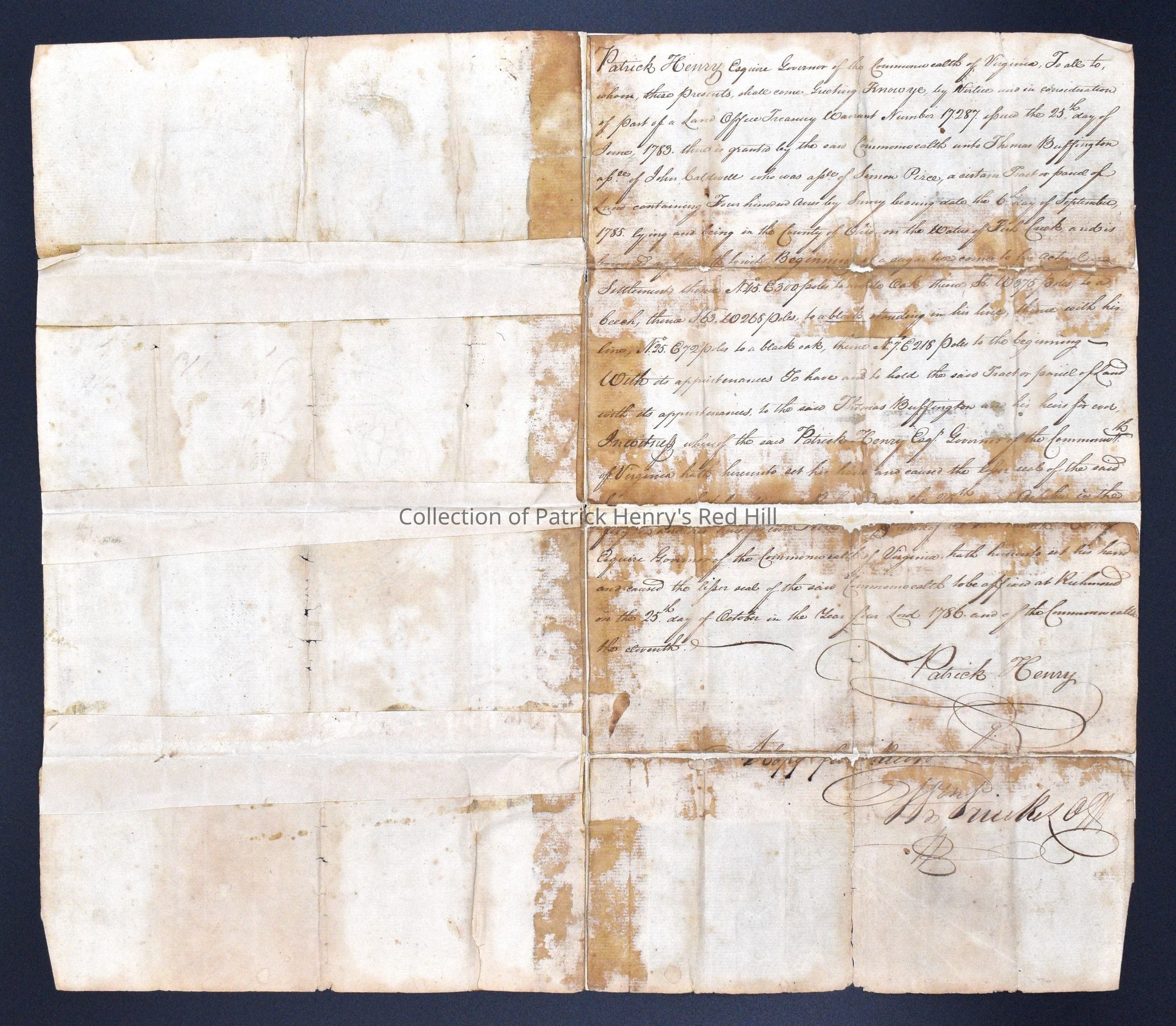 With its appurtenances To have and to hold, the said Tract or parcel of Land with its appurtenances, to the said Thomas Buffington and his heirs for ever, In writing, whereof the said Patrick Henry Esq. Governor of the Commonwealth of Virginia hath hereunto set his hand and caused the lesser seal of the said [loss of document] [___] the 25th of [___] October in the [___] and his heirs for ever [___] whereof the said Patrick Henry Esquire Governor of the Commonwealth of Virginia, hath hereunto set his hand and caused the lesser seal of the said Commonwealth to be affixed at Richmond on the 25th. day of October in the Year of our Lord 1786. and of the Commonwealth the eleventh. —