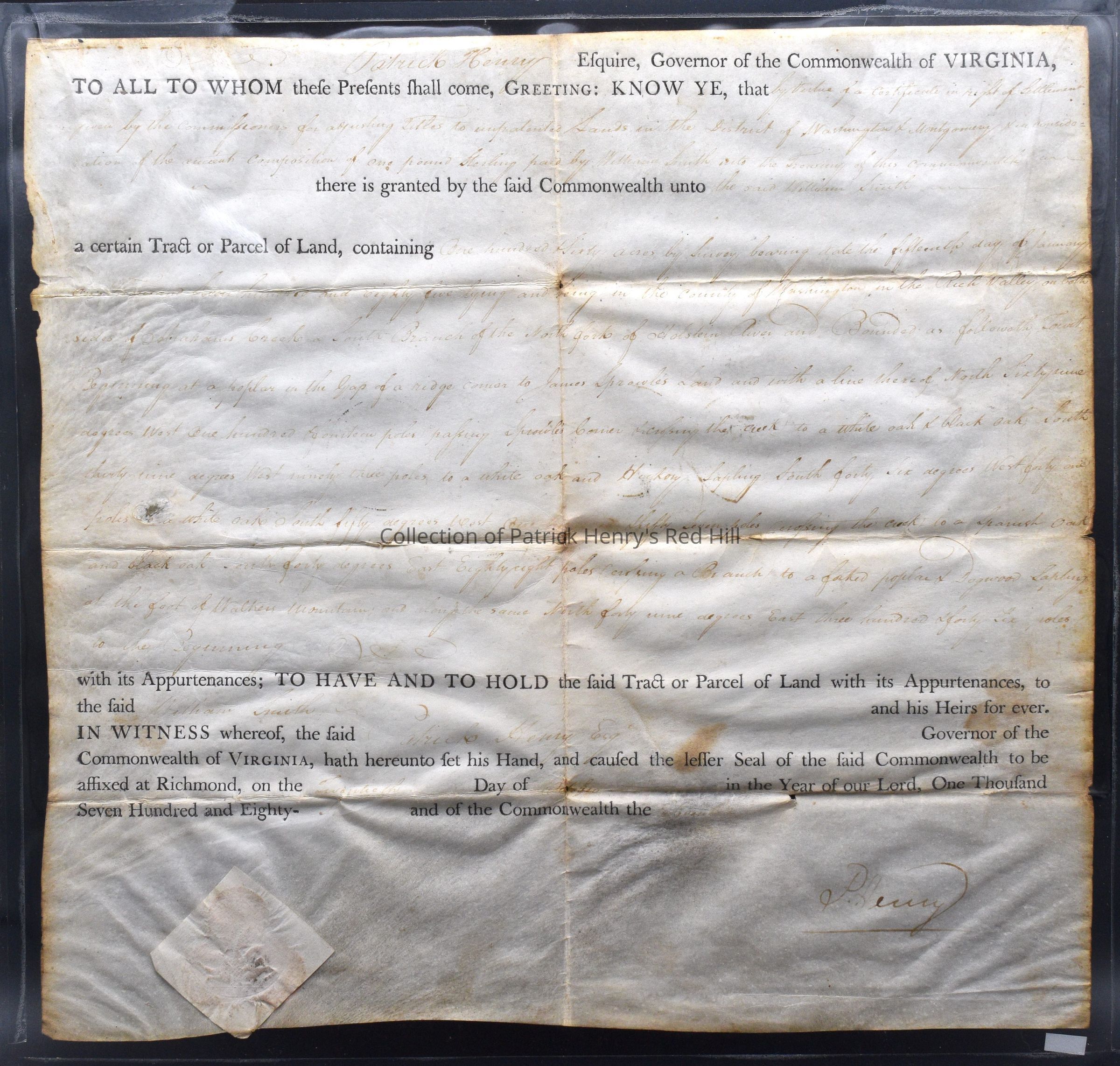 IN WITNESS whereof, the said Patrick Henry Esq Governor of the Commonwealth of VIRGINIA, hath hereunto set his Hand, and caused the lesser Seal of the said Commonwealth to be affixed at Richmond, on the Twentieth Day of October in the Year of our Lord, One Thousand Seven Hundred and Eighty- Six and of the Commonwealth the Eleventh.