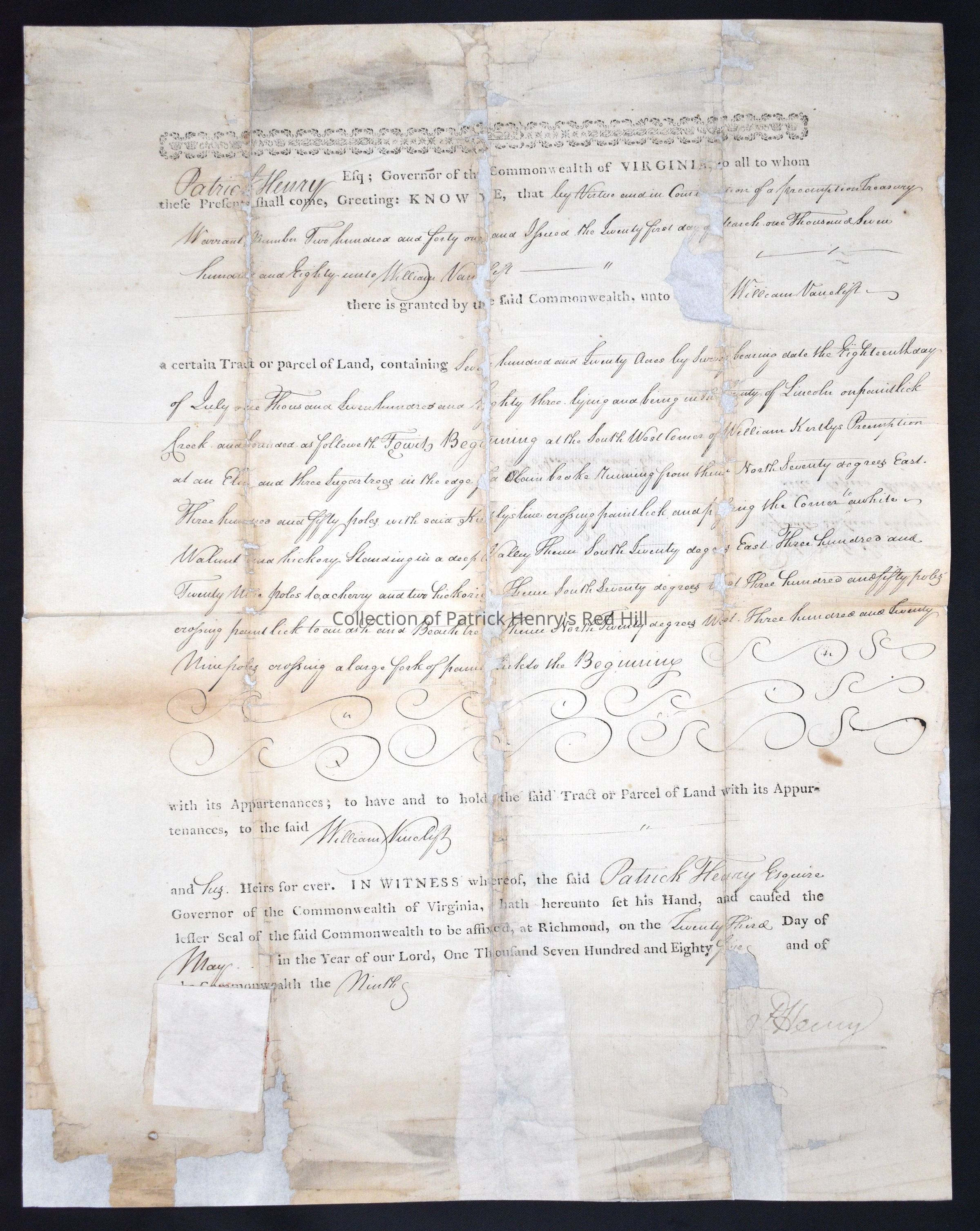 and his. Heirs for ever. IN WITNESS whereof, the said Patrick Henry Esquire Governor of the Commonwealth of Virginia, hath hereunto set his Hand, and caused the lesser Seal of the said Commonwealth to be affixed, at Richmond, on the twenty third Day of May. . . in the Year of our Lord, One Thousand Seven Hundred and Eighty five– and of the Commonwealth the ninth–