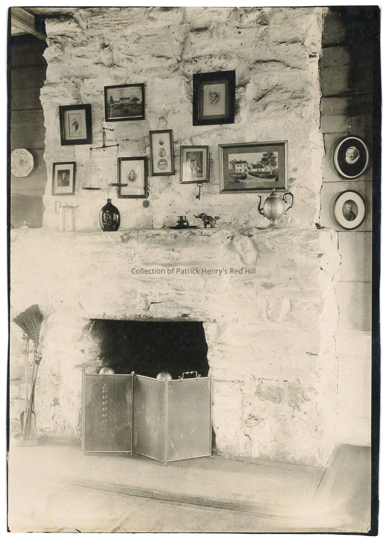 Although the location of this image was previously unknown, further investigation proved this to be a stone fireplace once in the law office of Patrick Henry. Stanhope Johnson, head architect during the principal restoration of Red Hill, identifies a similar photograph (95.24.1) as being the law office. This photograph may have been taken around the same time as the Johnson image. It was most likely taken after the mansion fire in February 1919, as the objects appearing here were formerly kept in the library or "Relic Room" of the mansion.