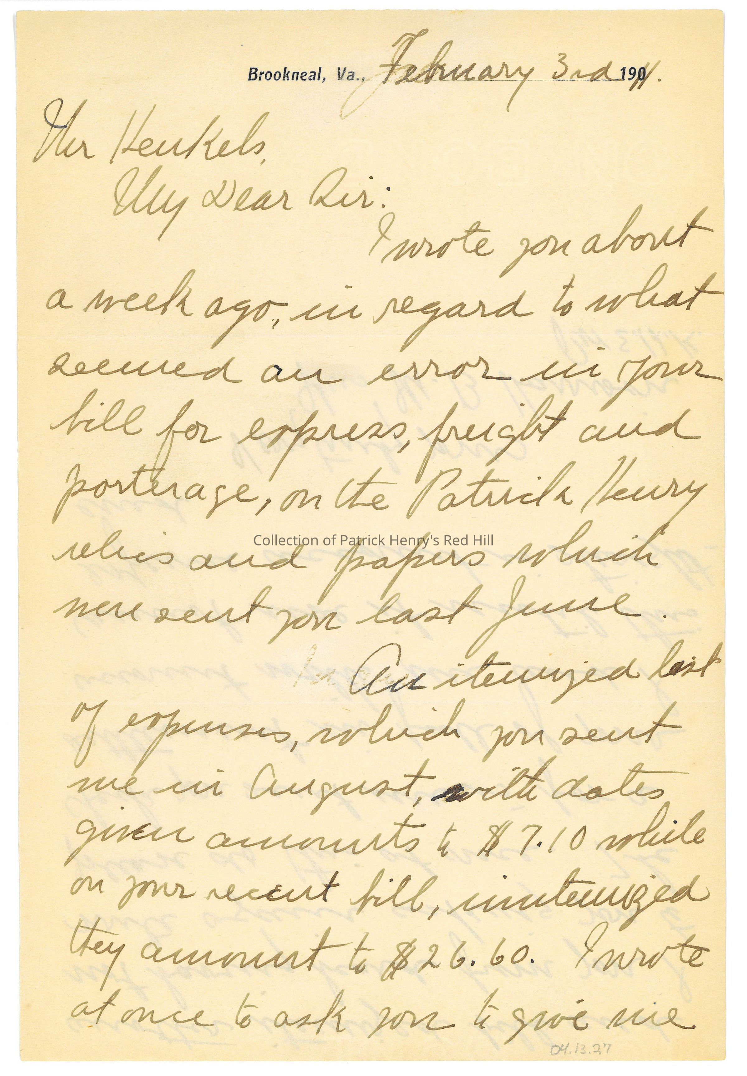 This letter belongs to a collection of correspondence primarily from Lucy Gray Henry Harrison (1857–1944) to Stanislaus “Stan” Vincent Henkels (1854–1926) concerning a proposed sale of Patrick Henry family heirlooms in 1910. Mrs. Harrison was Patrick Henry's great-granddaughter and the last Henry descendant to own and live at Red Hill. She grew up in Richmond, Virginia, and moved to Duluth, Minnesota, after marrying real estate millionaire Matthew Bland Harrison (1853–1892) in 1886. In 1905, she inherited Red Hill and moved onto the property, where she lived along with her sister, Elizabeth Watkins Henry Lyons (1855–1920), and her secretary, Elizabeth H. Kerper (1890–1964).