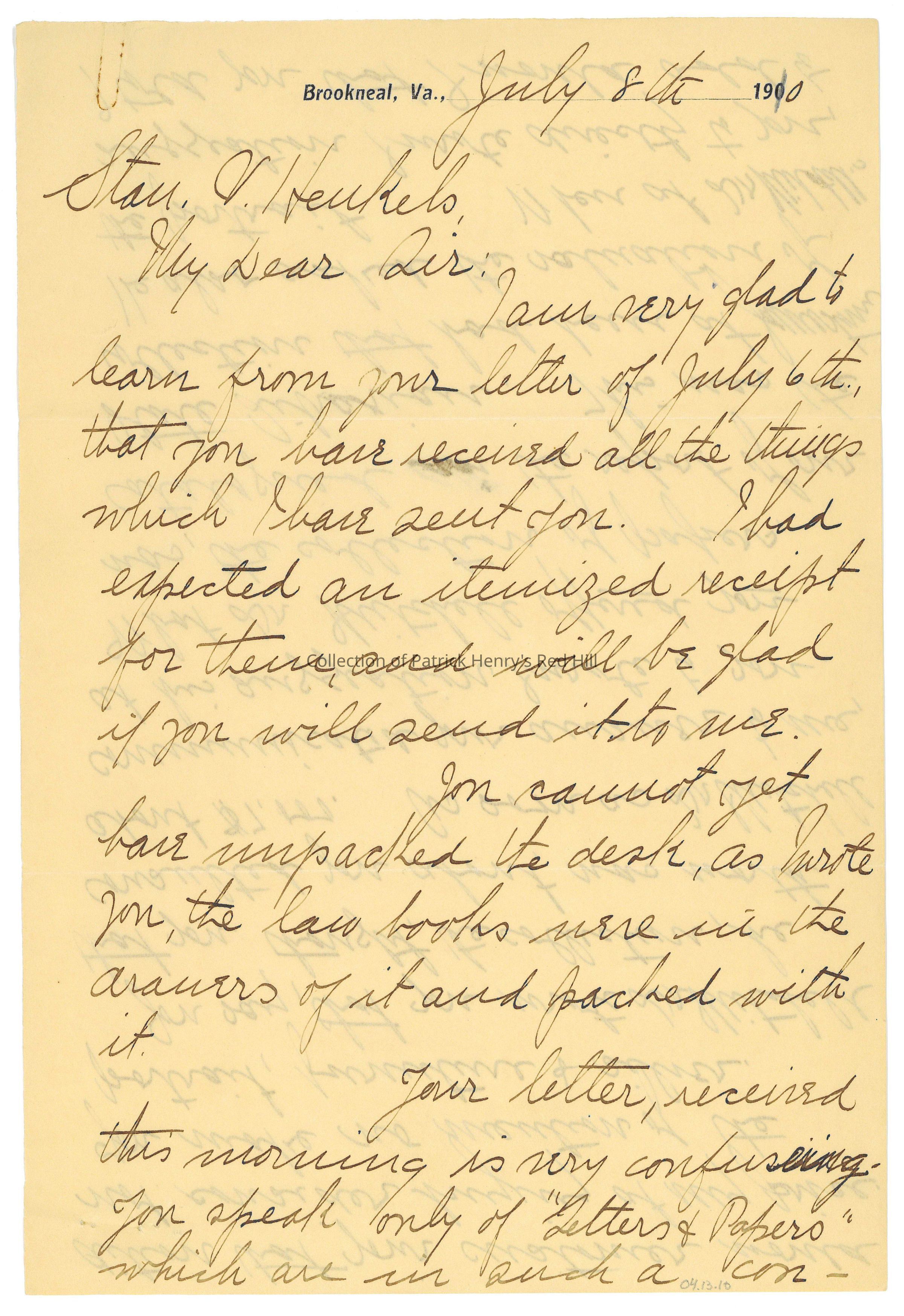 This letter belongs to a collection of correspondence primarily from Lucy Gray Henry Harrison (1857–1944) to Stanislaus “Stan” Vincent Henkels (1854–1926) concerning a proposed sale of Patrick Henry family heirlooms in 1910. Mrs. Harrison was Patrick Henry's great-granddaughter and the last Henry descendant to own and live at Red Hill. She grew up in Richmond, Virginia, and moved to Duluth, Minnesota, after marrying real estate millionaire Matthew Bland Harrison (1853–1892) in 1886. In 1905, she inherited Red Hill and moved onto the property, where she lived along with her sister, Elizabeth Watkins Henry Lyons (1855–1920), and her assistant, Elizabeth H. Kerper (1890–1964).