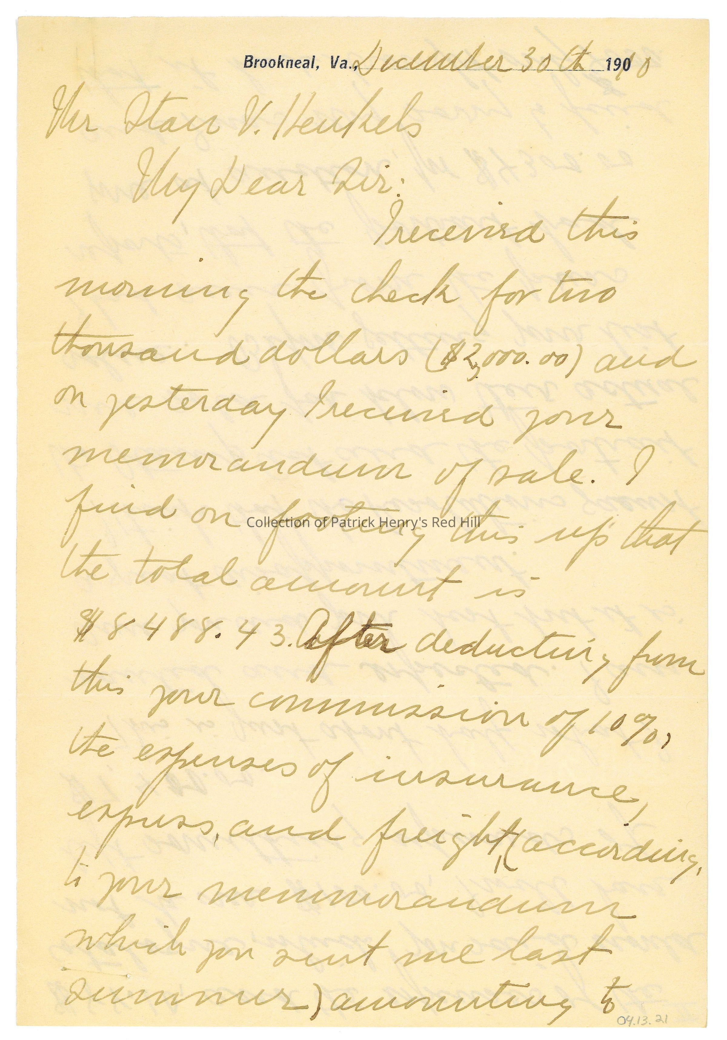 This letter belongs to a collection of correspondence primarily from Lucy Gray Henry Harrison (1857–1944) to Stanislaus “Stan” Vincent Henkels (1854–1926) concerning a proposed sale of Patrick Henry family heirlooms in 1910. Mrs. Harrison was Patrick Henry's great-granddaughter and the last Henry descendant to own and live at Red Hill. She grew up in Richmond, Virginia, and moved to Duluth, Minnesota, after marrying real estate millionaire Matthew Bland Harrison (1853–1892) in 1886. In 1905, she inherited Red Hill and moved onto the property, where she lived along with her sister, Elizabeth Watkins Henry Lyons (1855–1920), and her assistant, Elizabeth H. Kerper (1890–1964).