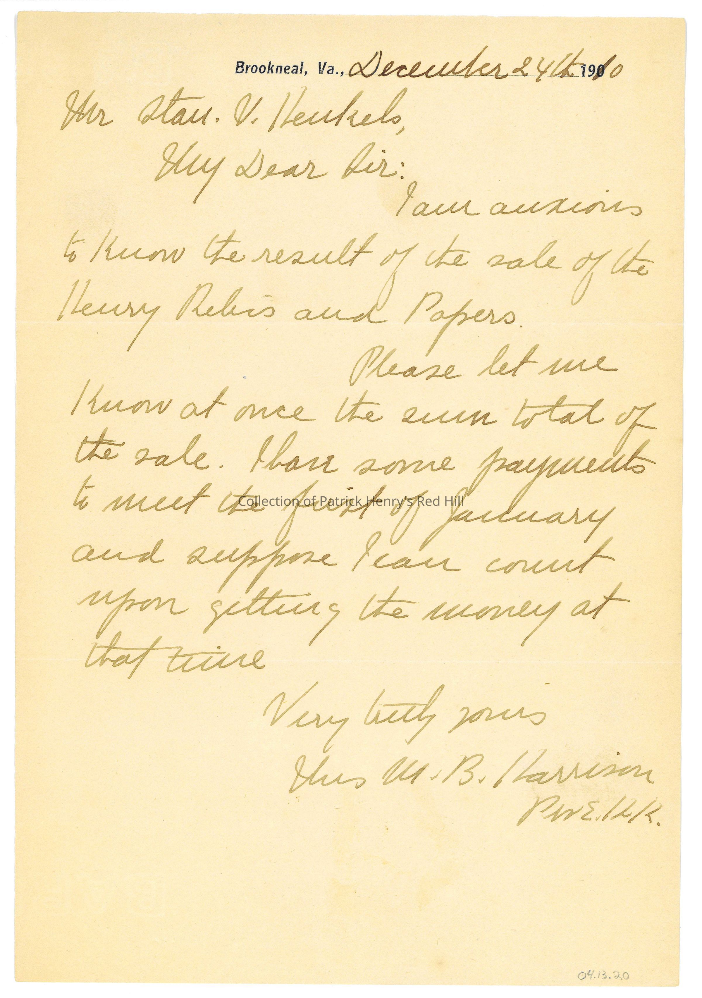 Mrs. Harrison inherited many of the family heirlooms that had belonged to Patrick Henry and many of his papers. In 1910, on the advice of Philadelphia neurologist and writer Dr. Weir Mitchell (1829–1914), she contacted Stan V. Henkels about a possible private sale or public auction of some of these pieces. Mr. Henkels was an antique dealer in Philadelphia well-known for his auctions and private sales to collectors. The correspondence from Mrs. Harrison to Mr. Henkels details their business negotiations from May 1910 leading up to the sale of the items in Philadelphia on December 20, 1910. It also includes letters concerning a settling of accounts between them up through February 1911.