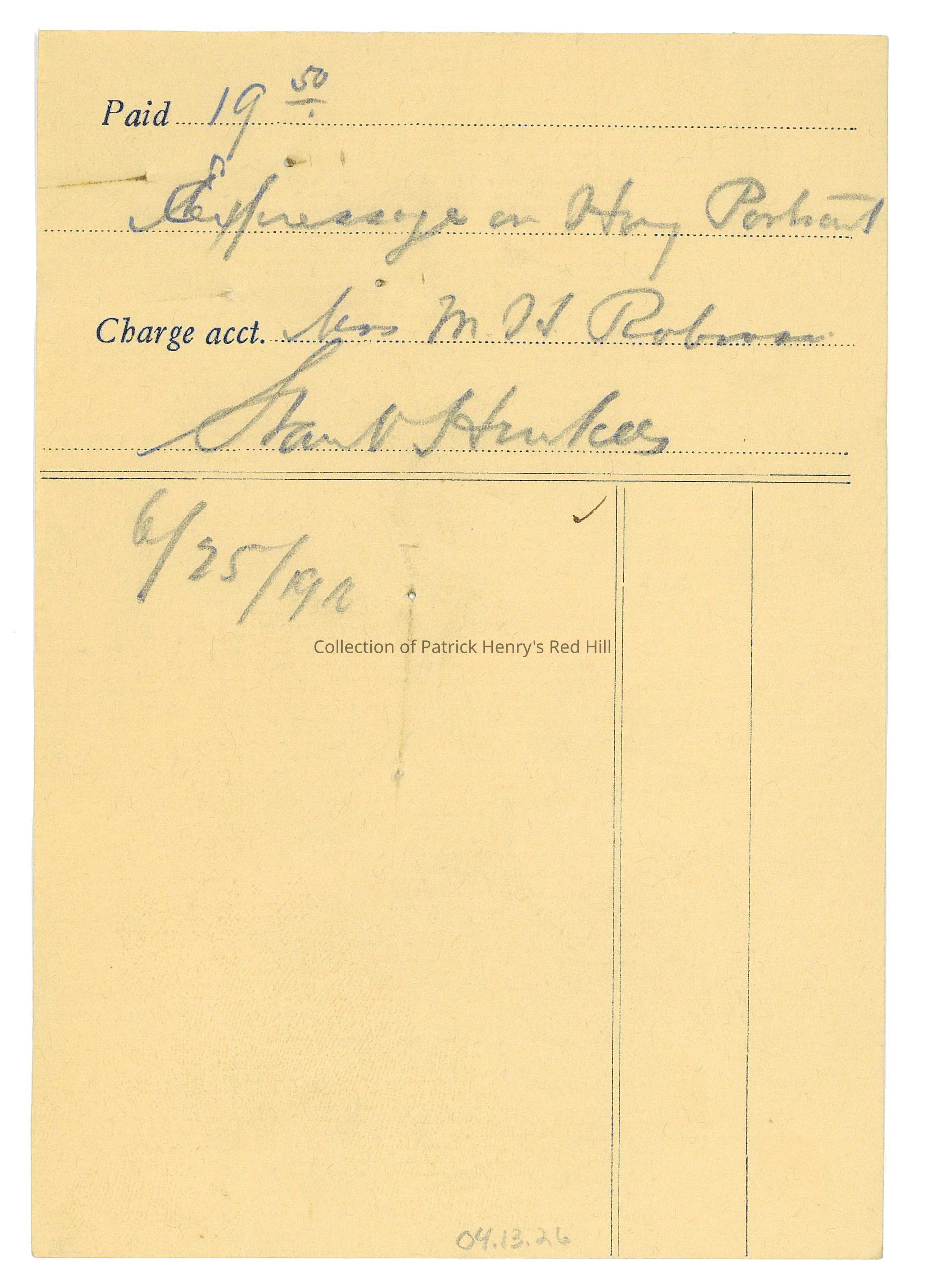 The Henry portrait mentioned in the receipt is Thomas Sully’s (1783–1872) oil painting of Patrick Henry, commissioned in 1815 by Henry’s first biographer, William Wirt (1772–1834). An engraving of the portrait was featured on the frontispiece of Wirt’s 1817 biography, “Sketches of the Life & Character of Patrick Henry.” Sully based the portrait on one of the few images of Henry painted from life: a 1795 miniature by Sully’s half-brother, Lawrence Sully (1769–1804). Thomas Sully’s portrait of Henry was given by Wirt to Henry’s youngest son, John (1796–1868), who passed the portrait on to his son William Wirt Henry (1831–1900), who loaned it to the Virginia State Library in Richmond from 1873 to 1884 before he passed it on to his daughter, Lucy Harrison. In 1902, Mrs. Harrison loaned the portrait again to the Virginia State Library but reclaimed it in 1910 to sell it at Mr. Henkels’ auction, where it was purchased by Charles Hamilton (1847–1930) for $4,000.