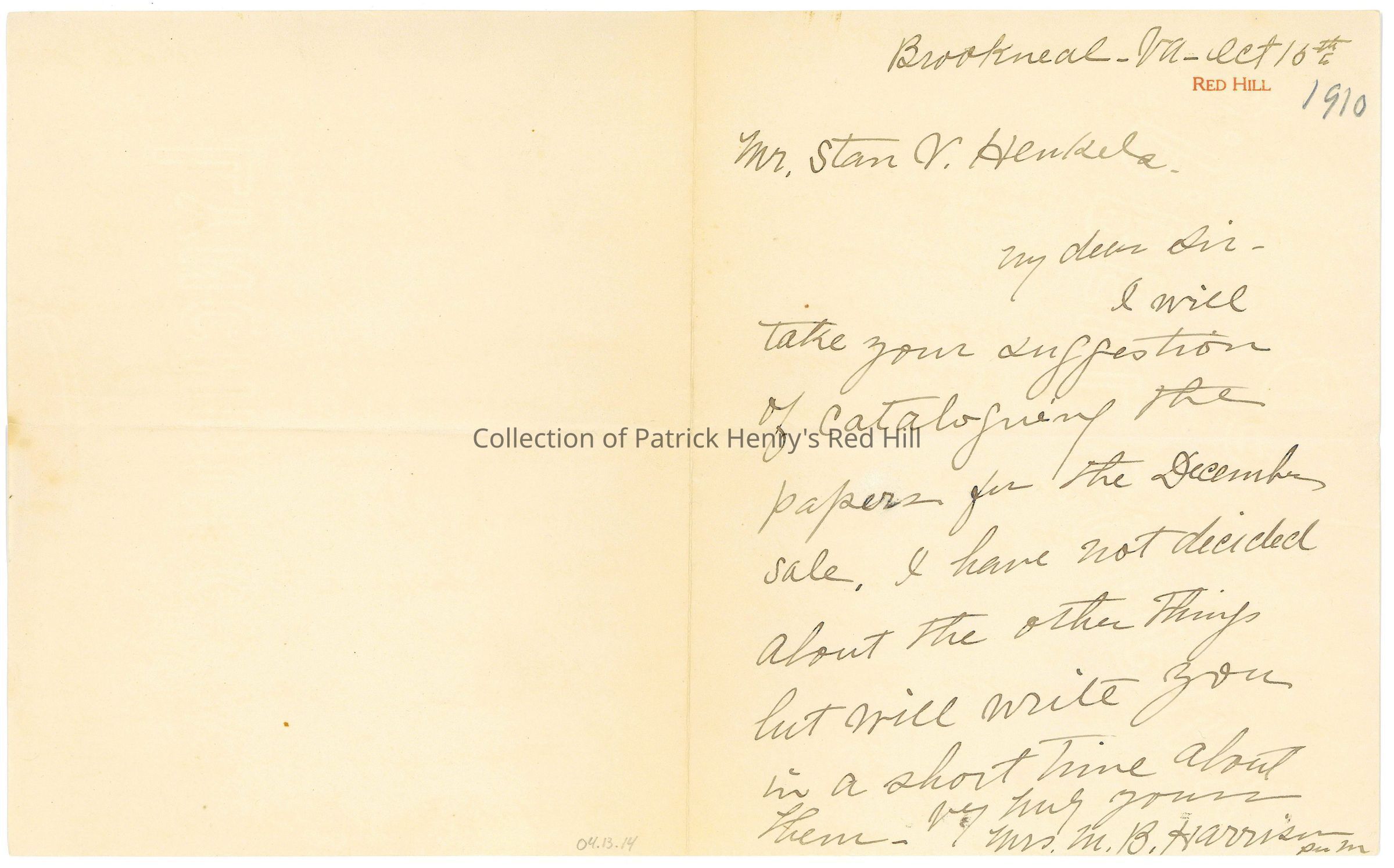 This letter belongs to a collection of correspondence primarily from Lucy Gray Henry Harrison (1857–1944) to Stanislaus “Stan” Vincent Henkels (1854–1926) concerning a proposed sale of Patrick Henry family heirlooms in 1910. Mrs. Harrison was Patrick Henry's great-granddaughter and the last Henry descendant to own and live at Red Hill. She grew up in Richmond, Virginia, and moved to Duluth, Minnesota, after marrying real estate millionaire Matthew Bland Harrison (1853–1892) in 1886. In 1905, she inherited Red Hill and moved onto the property, where she lived along with her sister, Elizabeth Watkins Henry Lyons (1855–1920), and her assistant, Elizabeth H. Kerper (1890–1964).