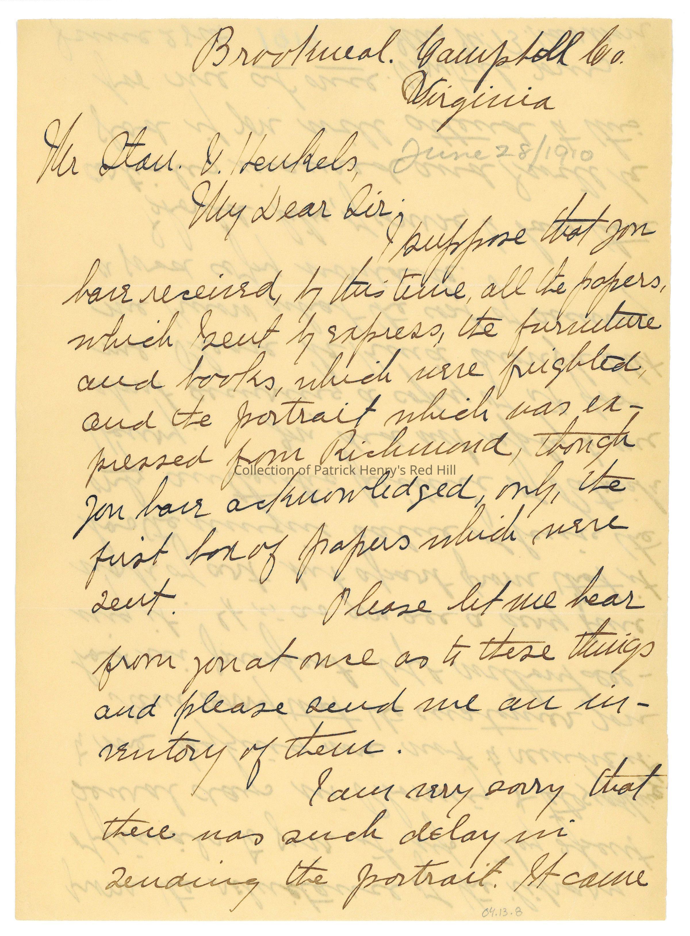 This letter belongs to a collection of correspondence primarily from Lucy Gray Henry Harrison (1857–1944) to Stanislaus “Stan” Vincent Henkels (1854–1926) concerning a proposed sale of Patrick Henry family heirlooms in 1910. Mrs. Harrison was Patrick Henry's great-granddaughter and the last Henry descendant to own and live at Red Hill. She grew up in Richmond, Virginia, and moved to Duluth, Minnesota, after marrying real estate millionaire Matthew Bland Harrison (1853–1892) in 1886. In 1905, she inherited Red Hill and moved onto the property, where she lived along with her sister, Elizabeth Watkins Henry Lyons (1855–1920), and her assistant, Elizabeth H. Kerper (1890–1964).