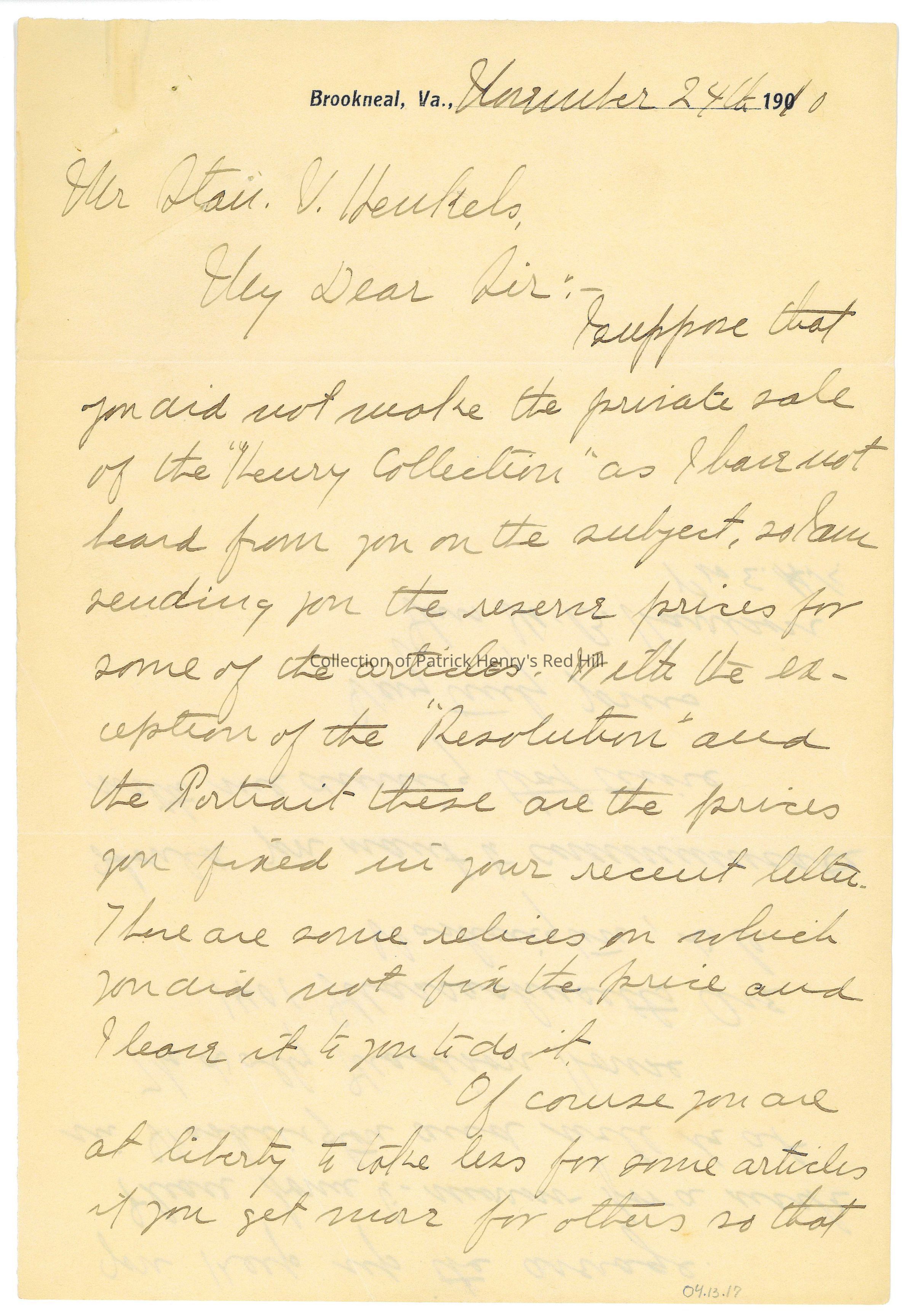Mrs. Harrison inherited many of the family heirlooms that had belonged to Patrick Henry and many of his papers. In 1910, on the advice of Philadelphia neurologist and writer Dr. Weir Mitchell (1829–1914), she contacted Stan V. Henkels about a possible private sale or public auction of some of these pieces. Mr. Henkels was an antique dealer in Philadelphia well-known for his auctions and private sales to collectors. The correspondence from Mrs. Harrison to Mr. Henkels details their business negotiations from May 1910 leading up to the sale of the items in Philadelphia on December 20, 1910. It also includes letters concerning a settling of accounts between them up through February 1911.