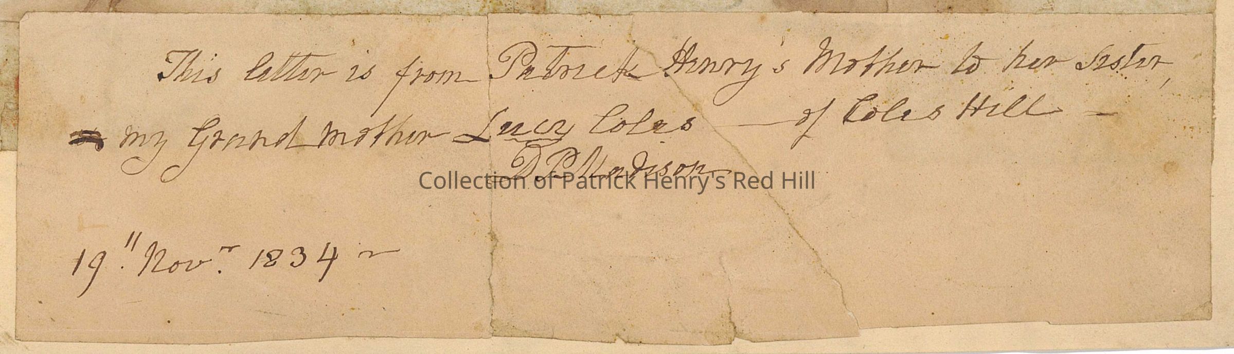 The letter was later passed to Dolley Payne Madison, a granddaughter of Lucy Coles and the wife of President James Madison (1751–1836). In November 1834, Dolley Madison wrote this note confirming the identities of the letter's sender and recipient. It was likely written from the Madisons' Montpelier plantation in Orange County, Virginia.