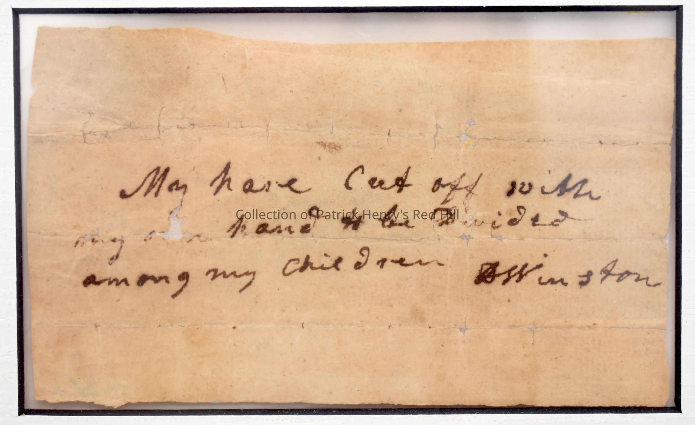 This note accompanied a lock of hair from Patrick Henry's widow, Dorothea Dandridge Henry (1757-1831), who married Judge Edmund Winston after Henry's death. She explains in this note that she cut off this hair with her own hand near to her death to preserve it for her children. The handwriting on this note is the same as that of Dorothea Dandridge Henry Winston's will.