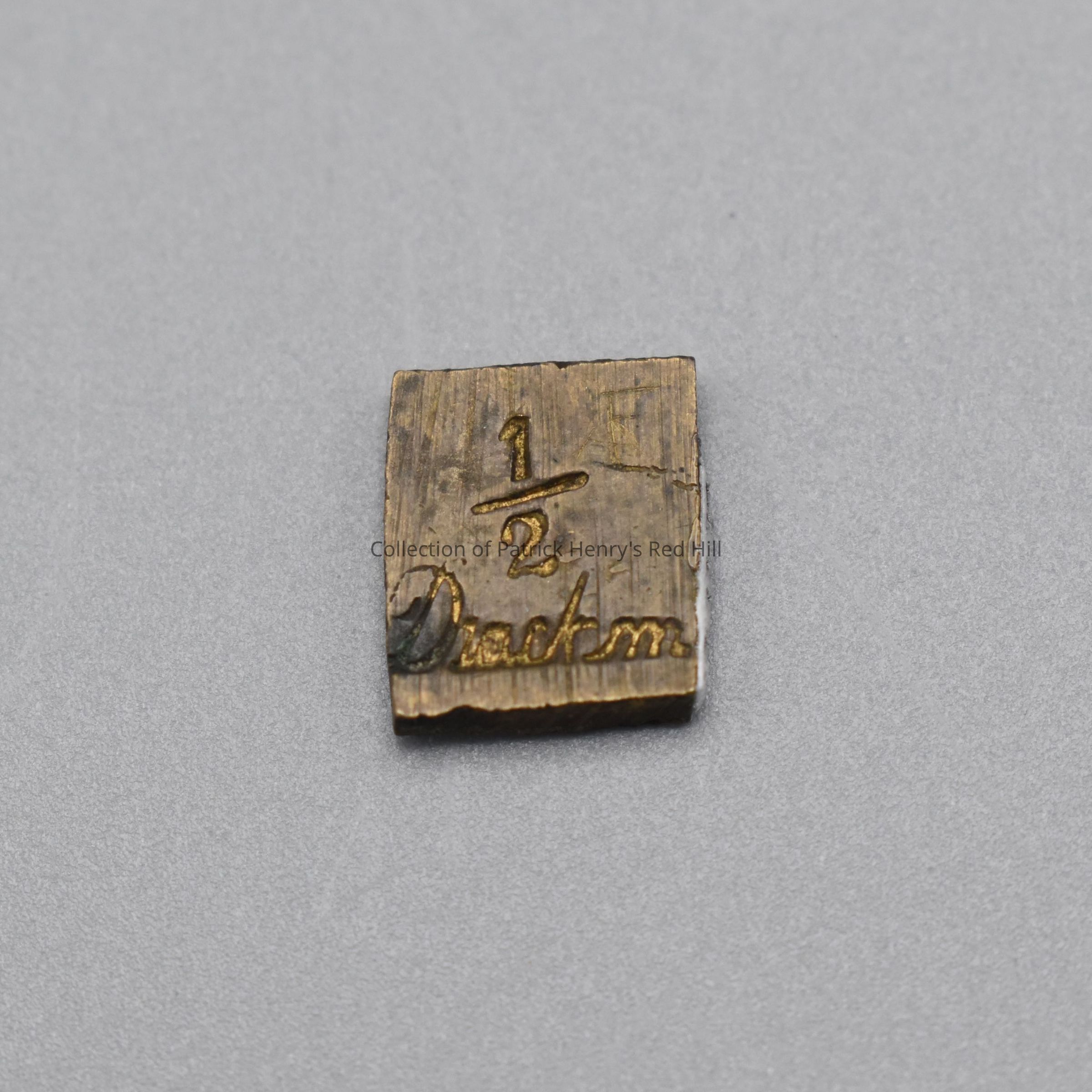 This one-half drachm brass weight comes from a larger set in the Henry family medicine chest (01.31.1).