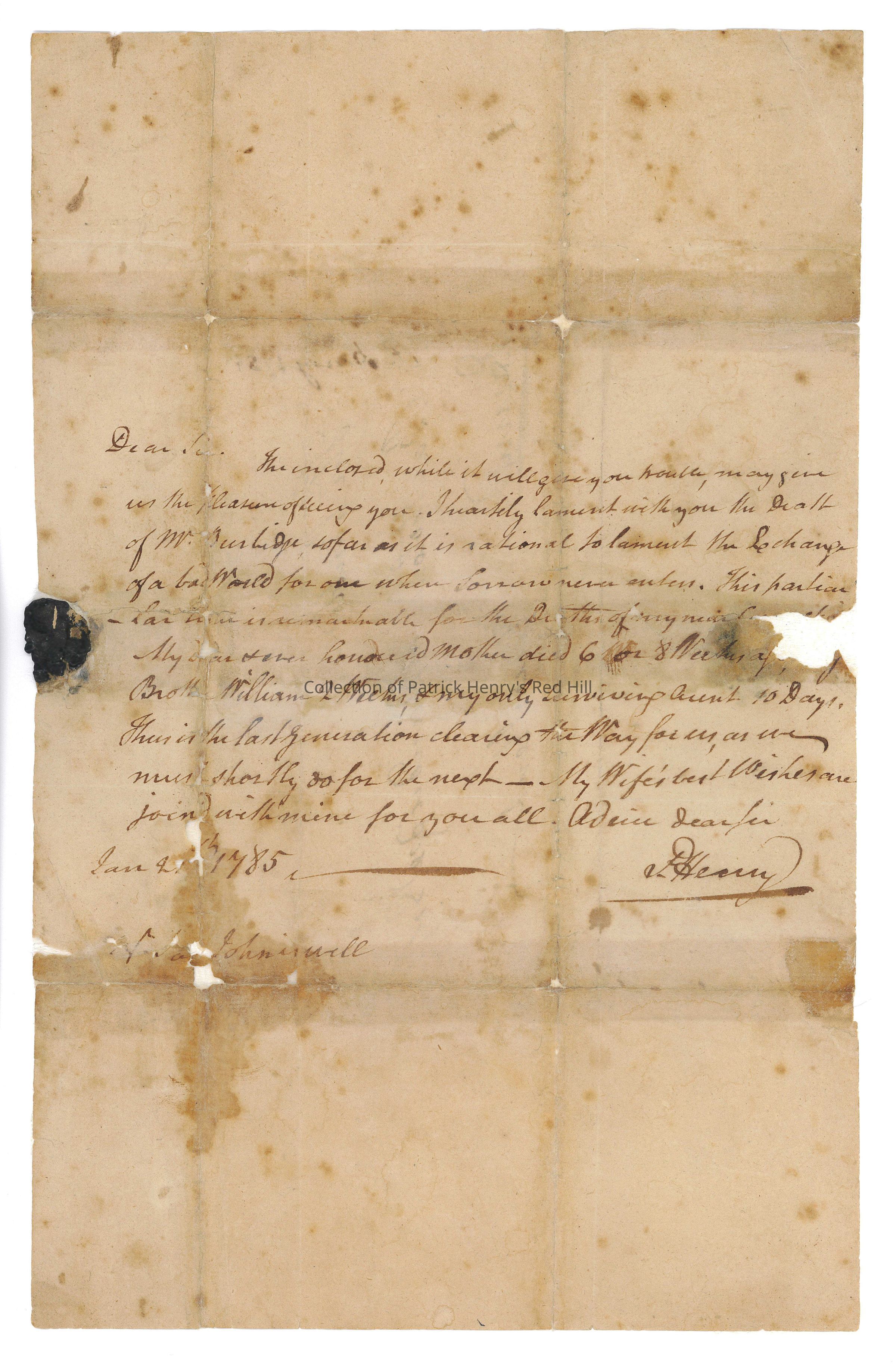 Patrick Henry wrote this letter to Bartholomew Dandridge (1737–1785) on January 21, 1785. He likely penned it at his Leatherwood plantation in Henry County, Virginia.