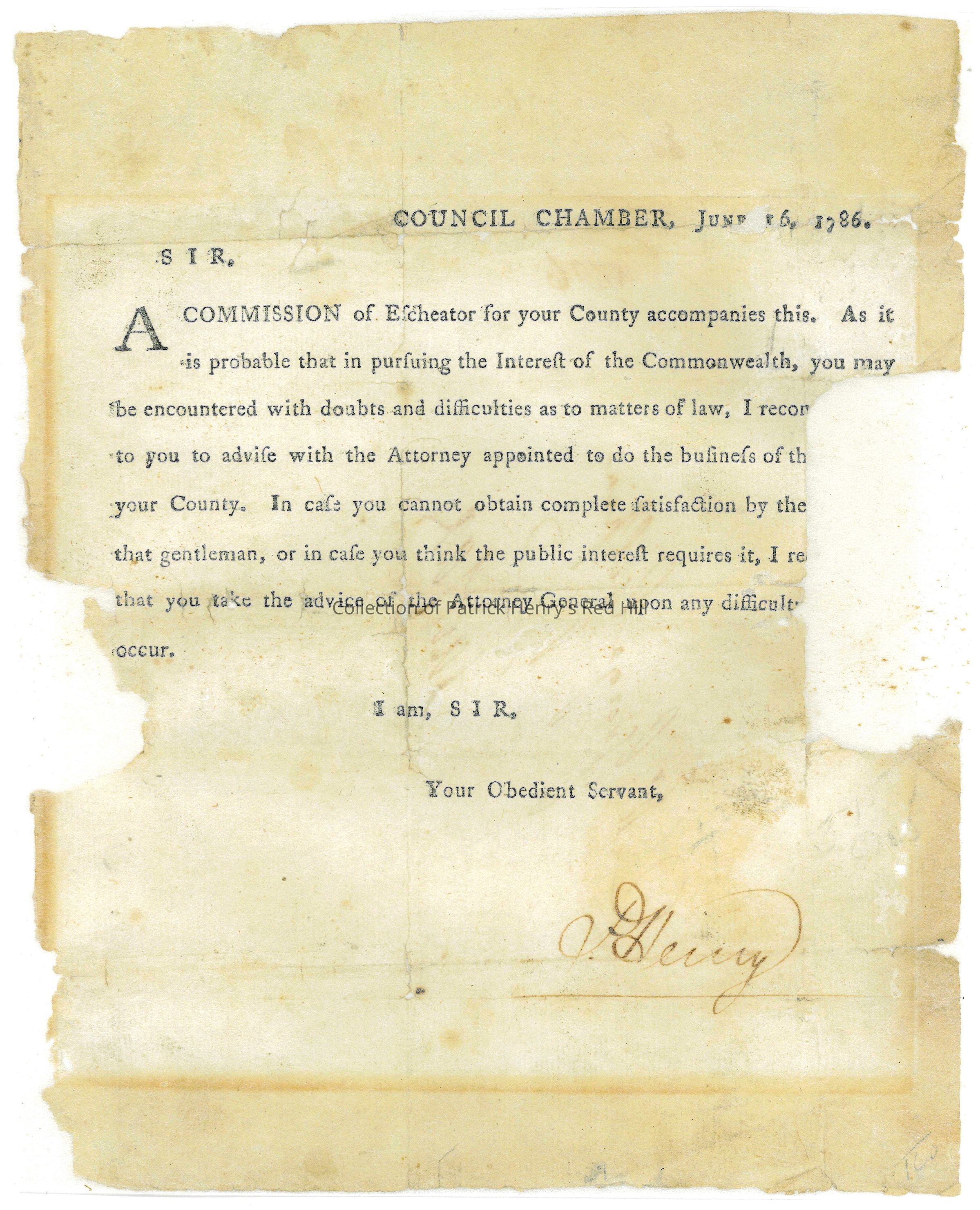 This letter was signed by Patrick Henry on June 16, 1786 during his fifth and last term as Governor of Virginia. This document accompanied a commission of escheator to a county in Virginia, advising the receiver to check with the attorney general on county business. This document was not included in the acquisition by PHMF