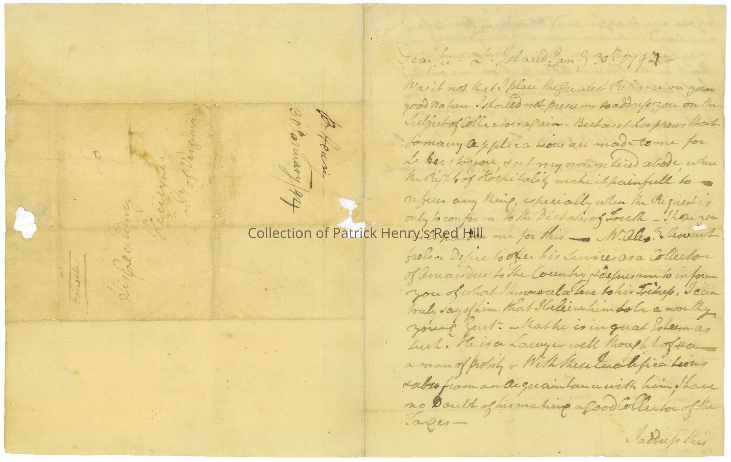 Patrick Henry wrote this letter to Henry "Light-Horse Harry" Lee III (1756–1818) on January 30, 1794, from his Long Island plantation. At this time, Lee was serving as governor of Virginia.