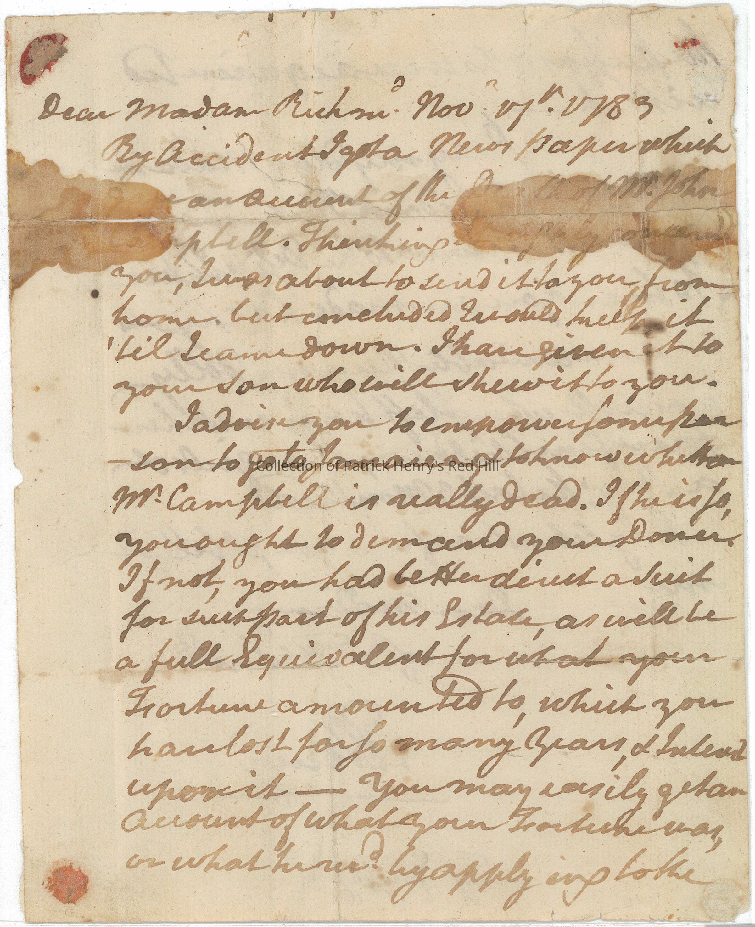 By Accident I got a News Paper which gave an account of the death of Mr. John Campbell. Thinking of __by concerns you, I was about to send it to you from home but concluded I would h___ it 'til I came down. I have given it to your Son who will shew it to you. I advise you to empower some person to go to Jamaica & to know whether Mr. Campbell is really dead. If he is so, you ought to demand your Dower. If not, you had better direct a Suit for such part of his Estate, as will be a full Equivalent for what your Fortune amounted to, which you have lost for so many Years, & Intend upon it—You many easily get an account of what your Fortune was, or what he recd, by applying to the the persons who were acquainted with it—Pray my dear madam execute the Freedom I take in your Affairs. It is owing to the Desire I have to hear you are made happy—Your amiable Niece, my Dolly was well, when I left home with her four fine children, three girls & a Boy; the last 3 months old. Pray let us hear from you, & believe me