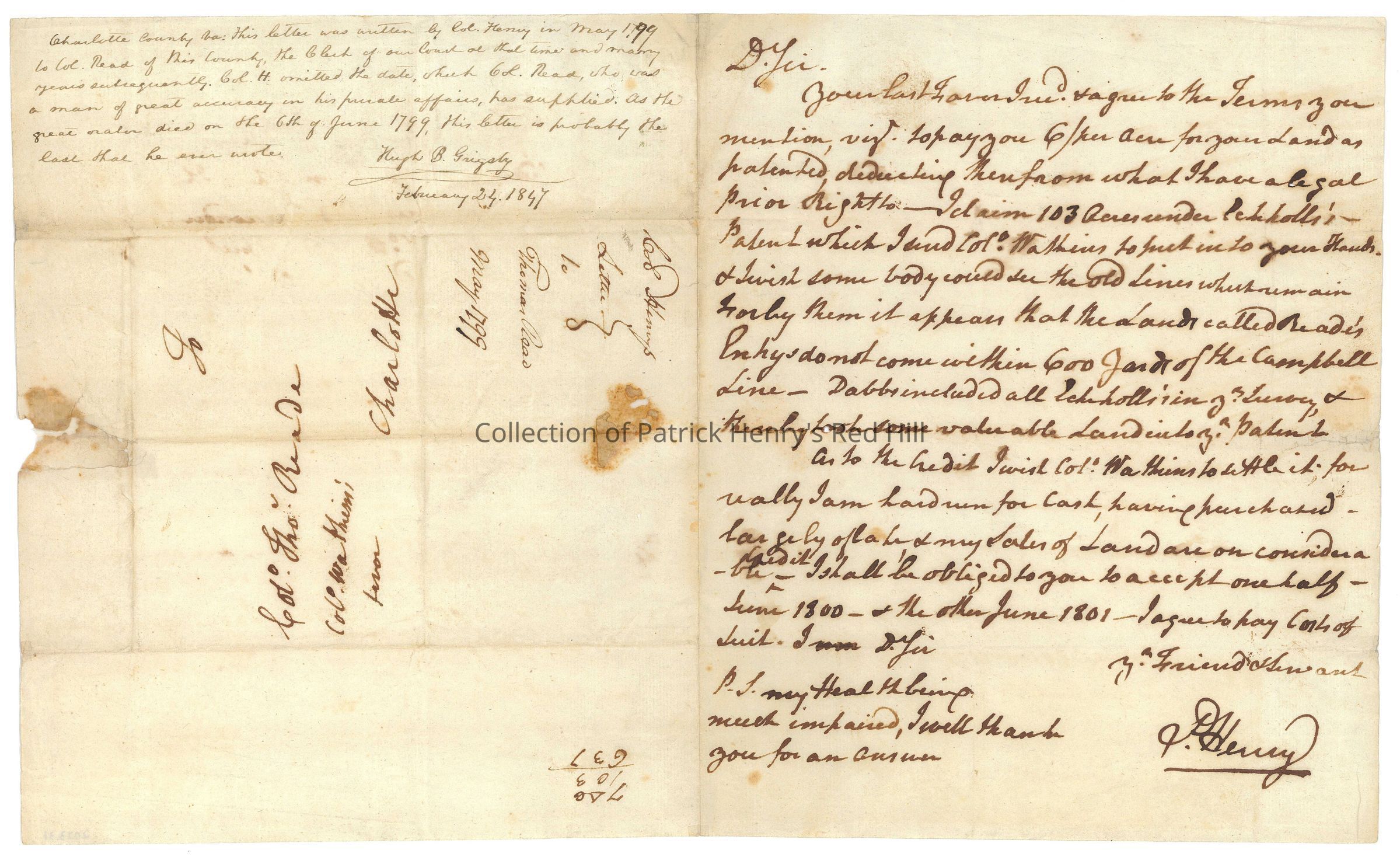 This letter was written by Patrick Henry to Thomas Read in May 1799, making it one of the last letters Henry ever wrote.