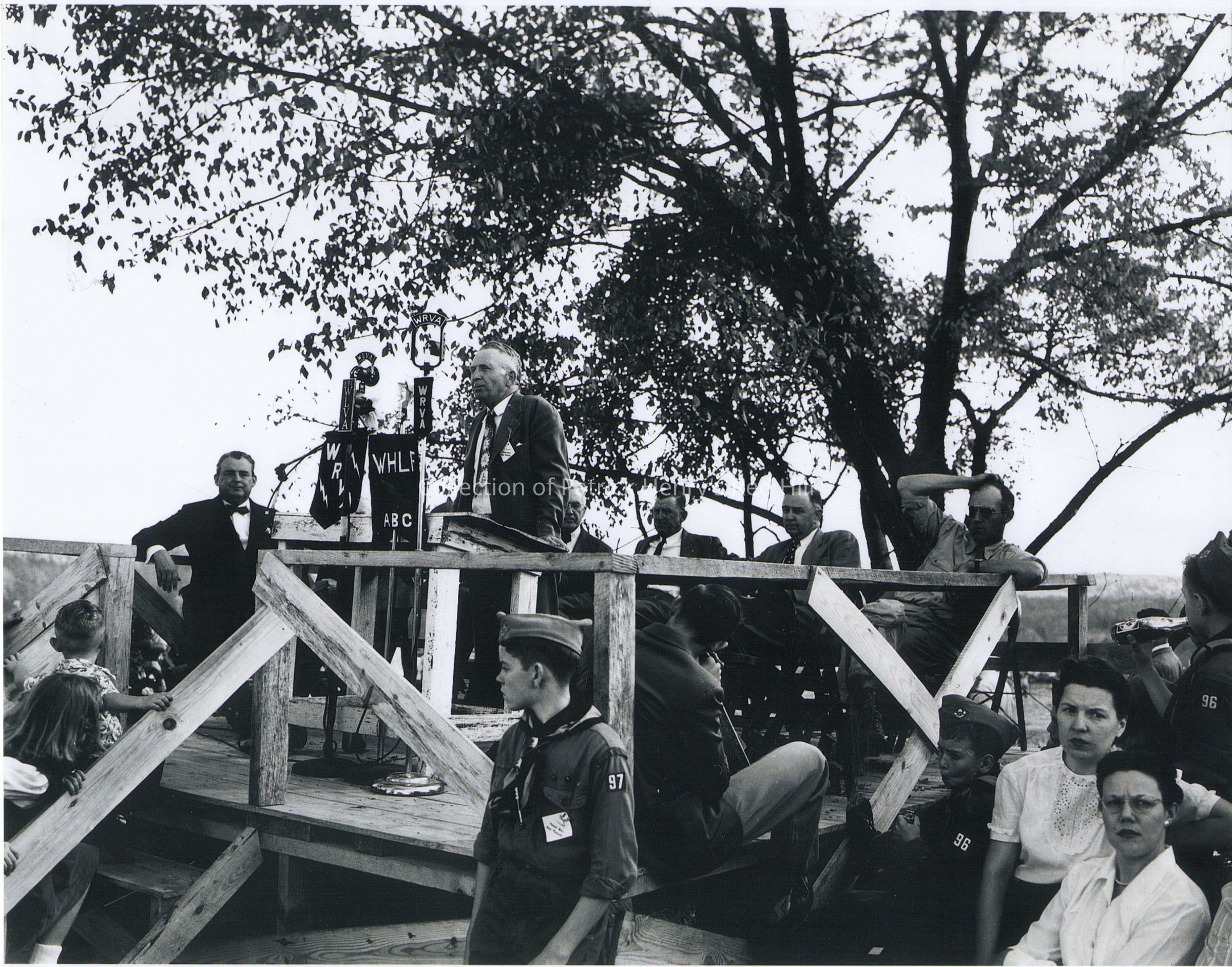 The photograph depicts S. A. Ozlin on a wooden stage speaking at a podium at "Miracle Day" adorned with banners with the acronyms "WRVA", "WLVA", and "WHLF" on them. To his right sits former Virginia Governor William M. Tuck (1896–1983).