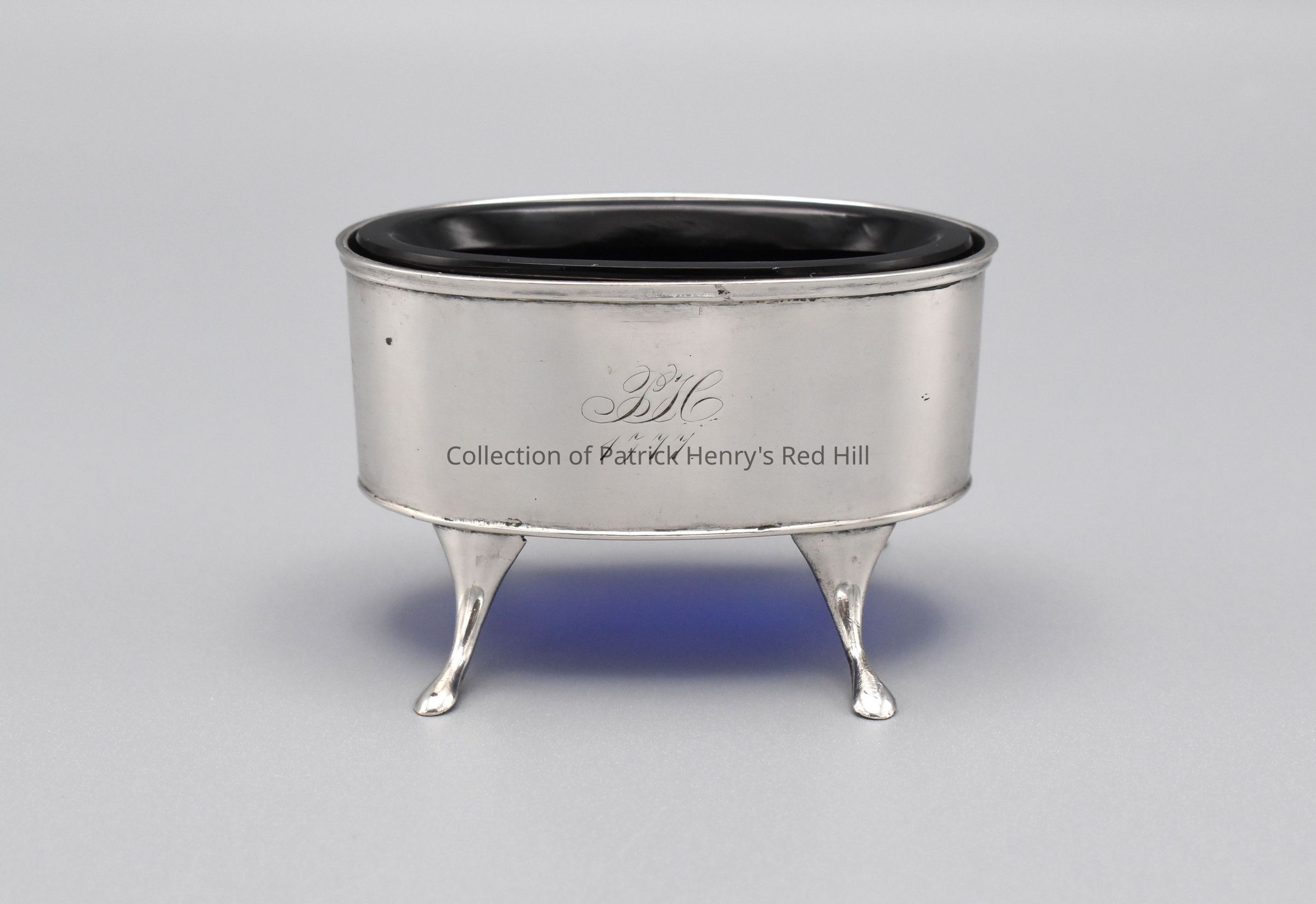 This coin silver saltcellar is one of a set originally belonging to Patrick Henry. The earliest recorded provenance for the saltcellars is detailed in a letter (04.13.2) by Henry's great-granddaughter, Lucy Gray Henry Harrison (1857–1944), to Philadelphia auctioneer Stan V. Henkels on May 25, 1910: "I have six pieces of silver which Henry bought in 1777, when he was first Governor of Virginia, they are a set of casters, very graceful design and fine workmanship, a silver frame for a platter and 4 salt cellars, these are oval in shape with 4 small feet and lined with blue glass (two of these blue glass linings are broken but can easily be replaced.) In every other respect the silver is in perfect condition and each piece is marked P.H. 1777." In a later letter (04.13.19) to Henkels dated December 10, 1910, Harrison recalls of the silver, "I have heard my father [William Wirt Henry (1831–1900)] say that it was supposed to have been bought at the sale of Lord Dunmore’s effects, but, even if this is not so it must have been imported." This has since been disproven. The "W·R" maker's mark on the underside of each piece attributes them to the work of Captain William Richardson (1755–1809) of Richmond, Virginia. Richardson was a notable figure in Richmond, later serving as the city's mayor. At the time these pieces were commissioned, around 1785, he was a young silversmith; the workmanship (e.g., the lack of piercing and engraving) demonstrates that a competent, though not expert, silversmith made them, as Mr. Richardson would have been at this time. William went into business with his brother, George, about 1782. The first mention of William appears in the Richmond enumeration of that same year, where he is listed with his father (a joiner), mother, brother, and two sisters. The first advertisement for their firm appeared in May 1785 when the brothers accepted two young apprentices. This suggests that the cellars could not have been made in 1777, as the engraving indicates, and are more likely to date to circa 1785. Patrick Henry likely received these saltcellars—either by purchase or gift—around 1785 while serving as governor in Richmond. They could have been inscribed with "PH 1777" to celebrate the anniversary of his marriage to Dorothea Dandridge, which occurred earlier on October 9, 1777, or his election to his second term as governor on May 29, 1777. Following Henry's death, the saltcellars were listed in an estate inventory taken at Red Hill in 1799. They appear as "1 ditto [Silver] Salts" worth £1, 4 shillings. They appear again in the 1802 estate inventory as "2 salt cellars." The cellars then descended from Patrick Henry to his widow, Dorothea, then to their youngest son, John (1796–1868). John Henry's son, William Wirt Henry (1831–1900), inherited them and passed them on to his daughter, Lucy Gray Henry Harrison (1856–1944). All four saltcellars appear in a photograph of Mrs. Harrison's dining room (76.144.6). After Mrs. Harrison's death, the Patrick Henry Memorial Foundation purchased the saltcellars from the executrix of her estate, Elizabeth Kerper, on June 30, 1945.
