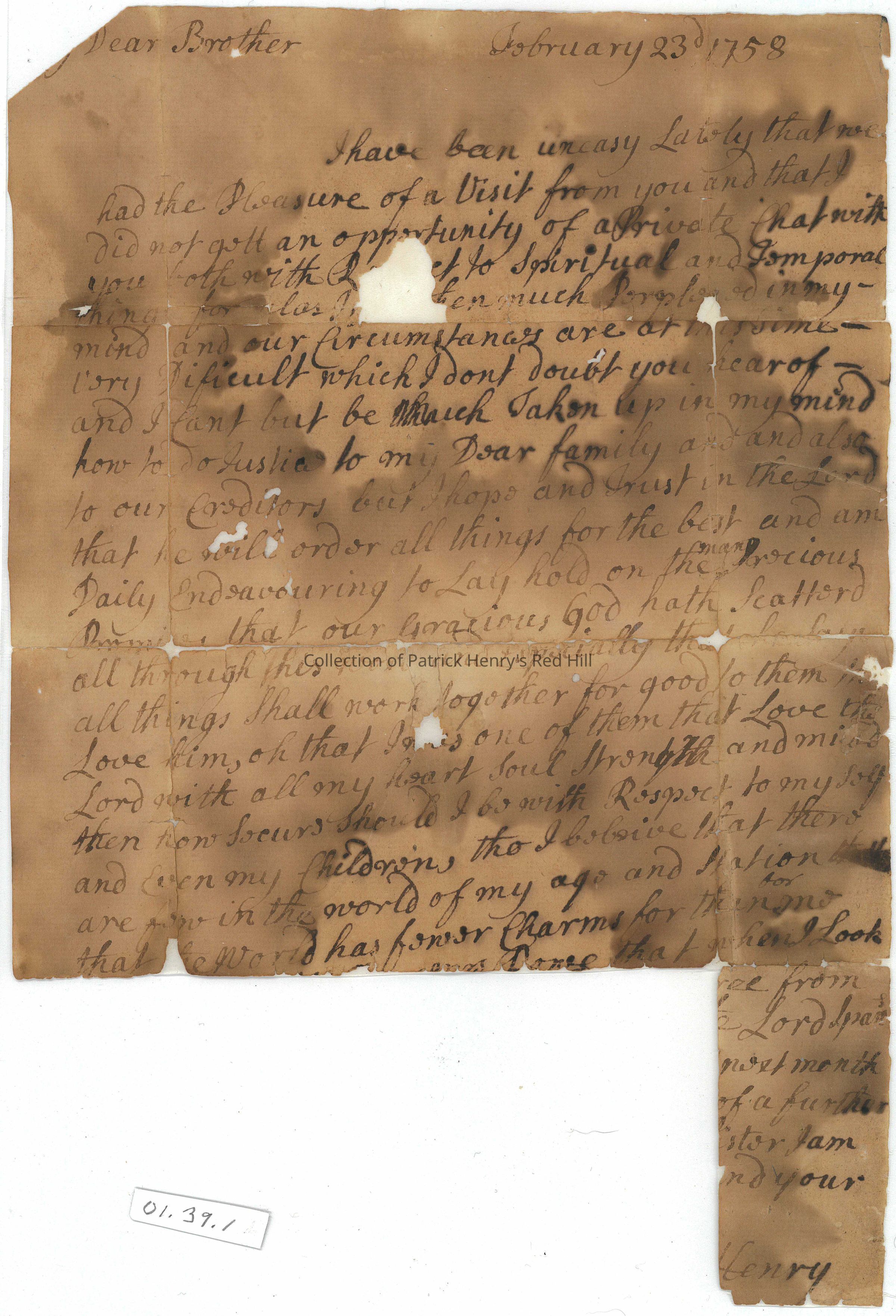 One page letter from Sarah Syme Henry to her brother William "Langloo" Winston, dated February 23, 1758. Mrs. Henry writes about her trust in the Lord during difficult financial circumstances. The letter is yellowed with age. It has large stains and several holes in the body of the text and is broken along the folds. The upper left corner is missing as well as the left and center portions of the lower quarter of the letter. All the edges are ragged. It is signed "Sarah Henry" but only the last name remains.