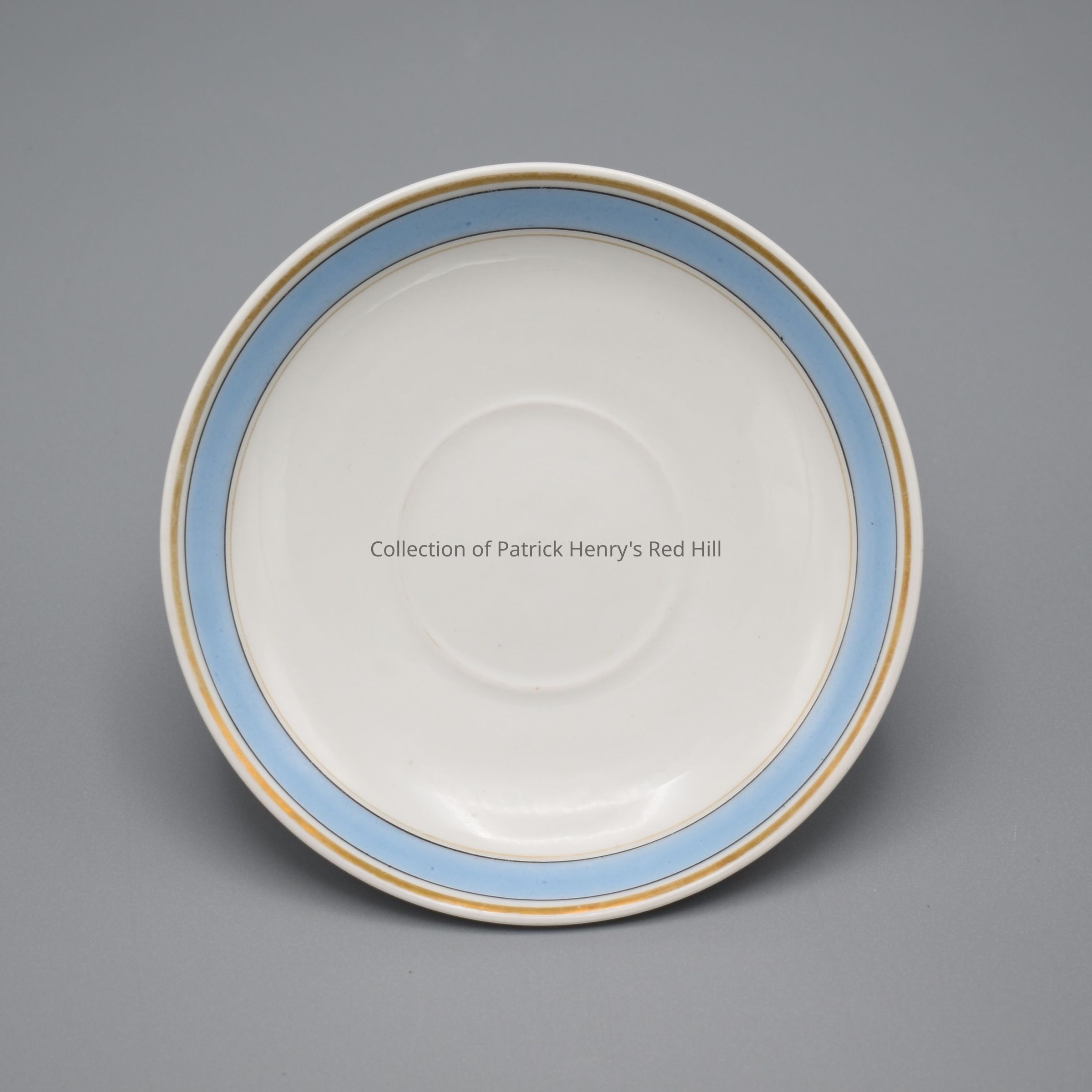 This saucer is part of a porcelain tea set that belonged to Margaret Ann Henry Miller (1827–1881). Margaret Ann Henry was born at Red Hill, the oldest child of John (1796–1868) and Elvira McClelland Henry (1808–1875), and a granddaughter of Patrick Henry through her father’s side. She married William Alexander Miller (1824–1923) in 1849 and the couple moved to Lynchburg, where they lived for the rest of their lives. Mr. Miller purchased this china for his wife sometime after their marriage. Excepting the seven replacement tea plates, the original porcelain pieces bear variations of the mark "GD." The mark may signify manufacture by Delinières & Guery, a late-19th-century porcelain company that operated in Limoges, France. In 1863, Pierre Guery opened a new porcelain factory on Rue Albert Thomas and was joined in business by his brother-in-law Rémi Delinières in 1869. The business operated under Guery’s and Delinières’ names until Guery died in 1878, after which it was known as Delinières & Co. Léonard Bernardaud bought the porcelain company in 1900. It still bears the Bernardaud name today. The china set remained in the Miller family, passing down to Margaret Penick Nuttle (1913–2009), the great-granddaughter of Margaret Ann Henry Miller and third-great granddaughter of Patrick Henry. Mrs. Nuttle descended from the Henry line through her mother, Margaret Dabney Penick (1879–1962), whose mother Florence Miller Dabney (1853–1923) was the daughter of Margaret Henry Miller. In October 2000, Mrs. Nuttle donated the china to the Patrick Henry Memorial Foundation.