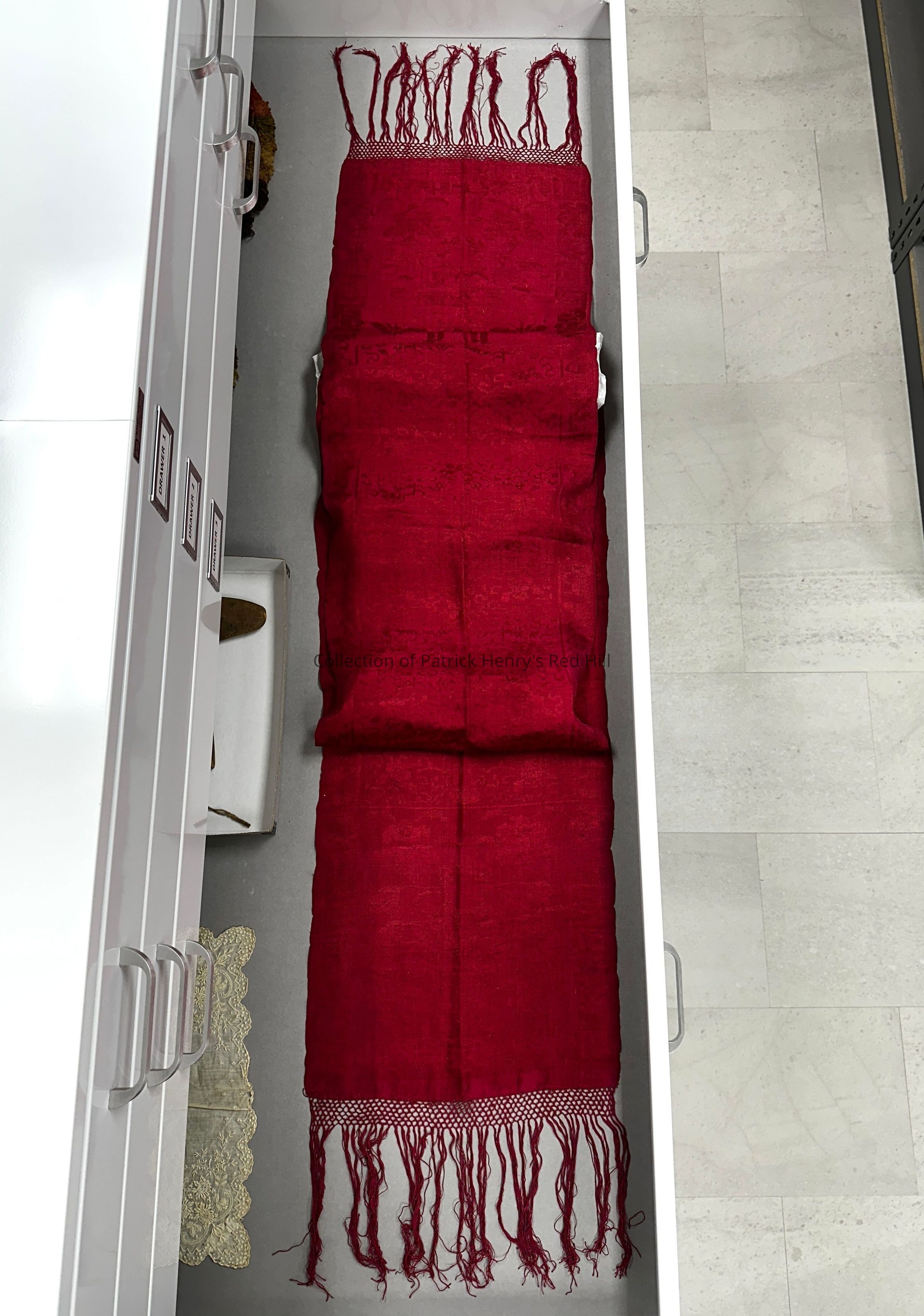 This scarf was given to the Patrick Henry Memorial Foundation on May 3, 2023, by Monique and Philip Heller. They inherited this object and the others in this accession from her stepmother, Catherine Spotswood Fontaine Lawrence (1938–2015), a third-great-granddaughter of Patrick Henry. Reverend Patrick Henry Fontaine was her grandfather.