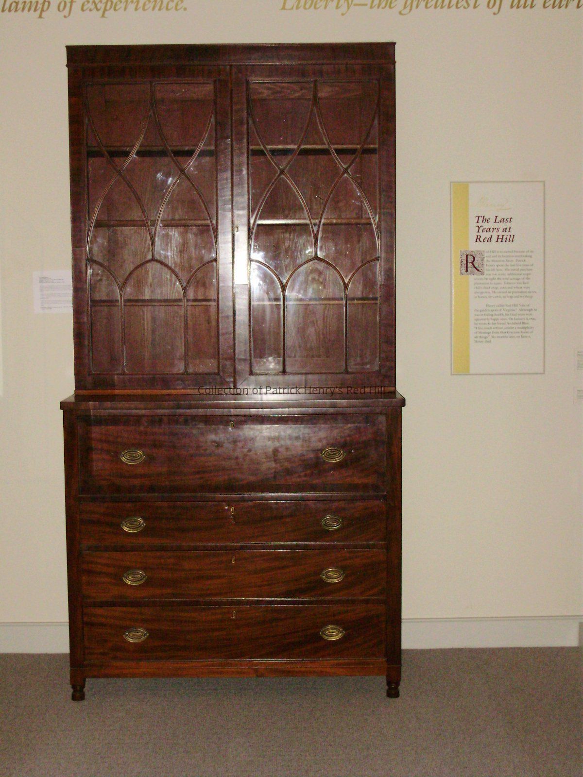 Alexander Spotswood Henry was supposed to have been a great reader, so it makes sense he would have a piece of furniture like this. After the death of Alexander Henry in 1854, the desk passed from his home in Shady Grove to his daughter Sarah Winston Henry Carrington (1821–1906), who married her cousin Dr. George Cabell Carrington (1819–1880). Their son Richard Bruce Carrington (1858–1927) inherited the desk. After the passing of Richard Bruce Carrington, his widow, Ida Harrison Carrington (1863–1946), kept the desk as a prized possession in their Richmond home. An interview with Mrs. Carrington in the "Richmond Times-Dispatch" in 1935 mentions the desk as having passed down to Alexander Spotswood Henry from his father, Patrick Henry. Modern appraisals indicate this could not be the case. Workmanship proves that the desk and the bookcase section were made after Henry's death in 1799.