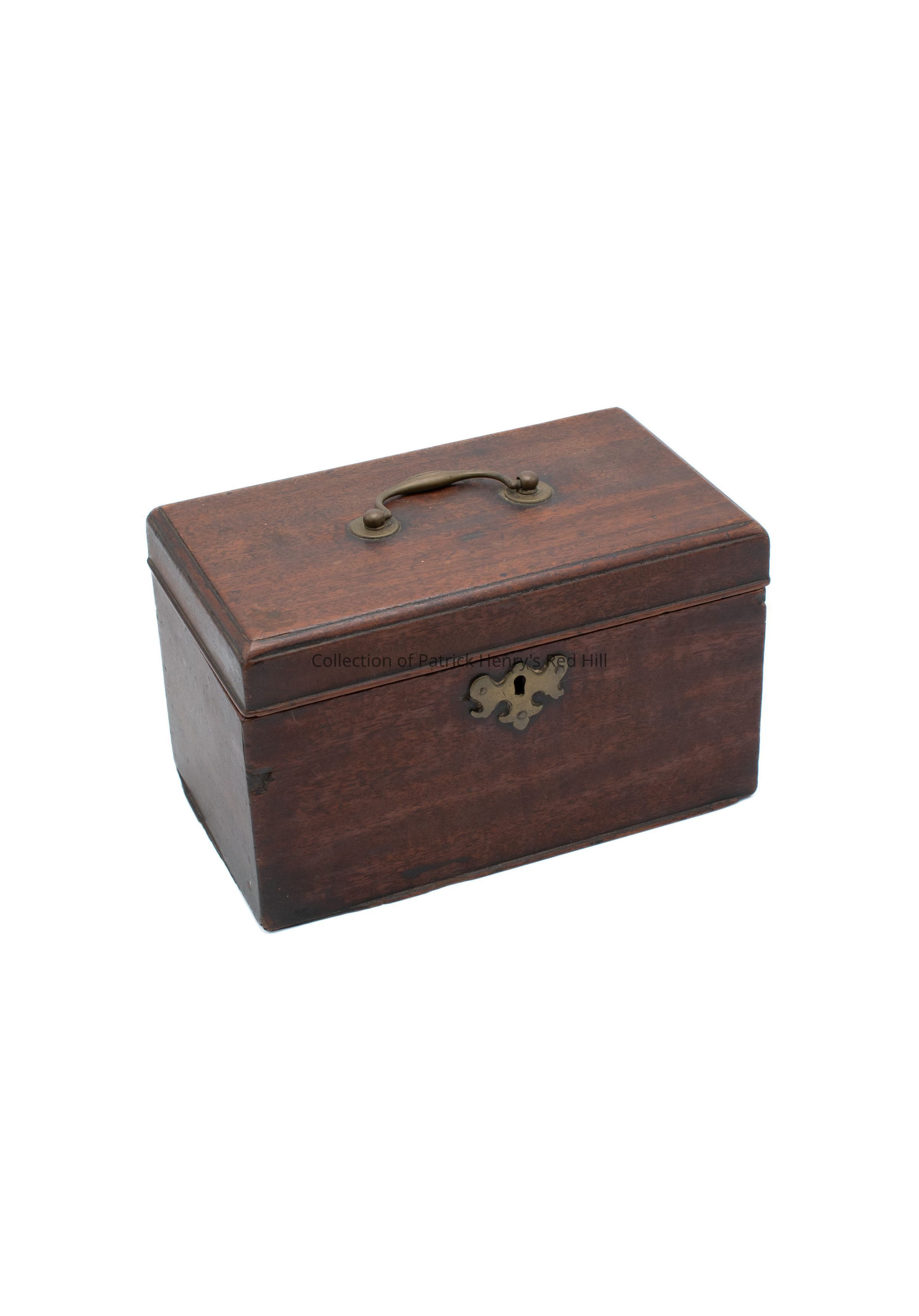 This particular tea chest has a simple, box-like design that suggests its use was more practical than decorative. The divided interior would have allowed green and black tea to be separated—often in metal tea canisters—into the two outside cubbies, with a mixing bowl and spoon stored in the center. The bowl and spoon were lost before this chest came to PHMF. It is believed to have been used by Patrick Henry as a lock box for money.