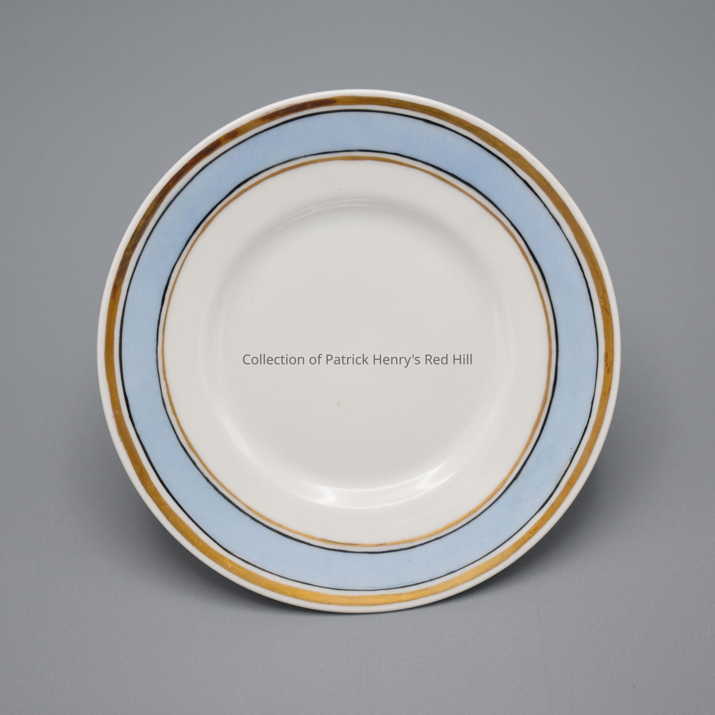 This replacement porcelain tea plate was commissioned to match a set belonging to Margaret Ann Henry Miller (1827–1881). Margaret Ann Henry was born at Red Hill, the oldest child of John (1796–1868) and Elvira McClelland Henry (1808–1875), and a granddaughter of Patrick Henry through her father’s side. She married William Alexander Miller (1824–1923) in 1849 and the couple moved to Lynchburg. Mr. Miller purchased the original china set for his wife sometime after their marriage. The replacement set has a green manufacturer's mark with an underlined P|S, with “Bavaria” written underneath. In blue, the letters WCFR are written overlapping each other in a vertical line. This set is believed to have been manufactured by the Fr. Böhme Porzellanfabrik in Sorau, Brandenburg, Germany sometime during the late 19th or early 20th century. The factory was started by Gustav Otremba in 1888, and joined by Franz Böhme, who became the sole owner in 1892. Eventually, the company was obtained by the Christian & Ernst Carstens consortium and renamed C. & E. Carstens Porzellanfabrik Sorau N.L. The factory in Brandenburg was destroyed by a fire in 1945. The china set remained in the Miller family, passing down to Margaret Penick Nuttle (1913–2009), the great-granddaughter of Margaret Ann Henry Miller and third-great granddaughter of Patrick Henry. Mrs. Nuttle descended from the Henry line through her mother, Margaret Dabney Penick (1879–1962), whose mother Florence Miller Dabney (1853–1923) was the daughter of Margaret Henry Miller. In October 2000, Mrs. Nuttle donated the china to the Patrick Henry Memorial Foundation.