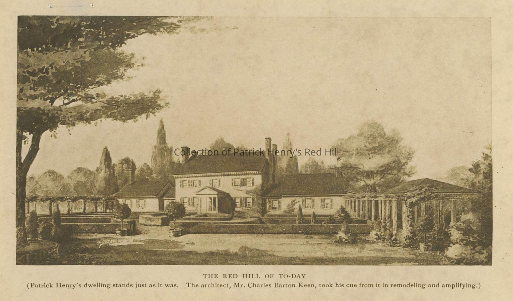 Printed underneath the picture: "The Red Hill of Today, Patrick Henry's dwelling stands just as it was. The architect, Mr. Charles Barton Keen, took his cue from it in remodeling and amplifying it."Provenance