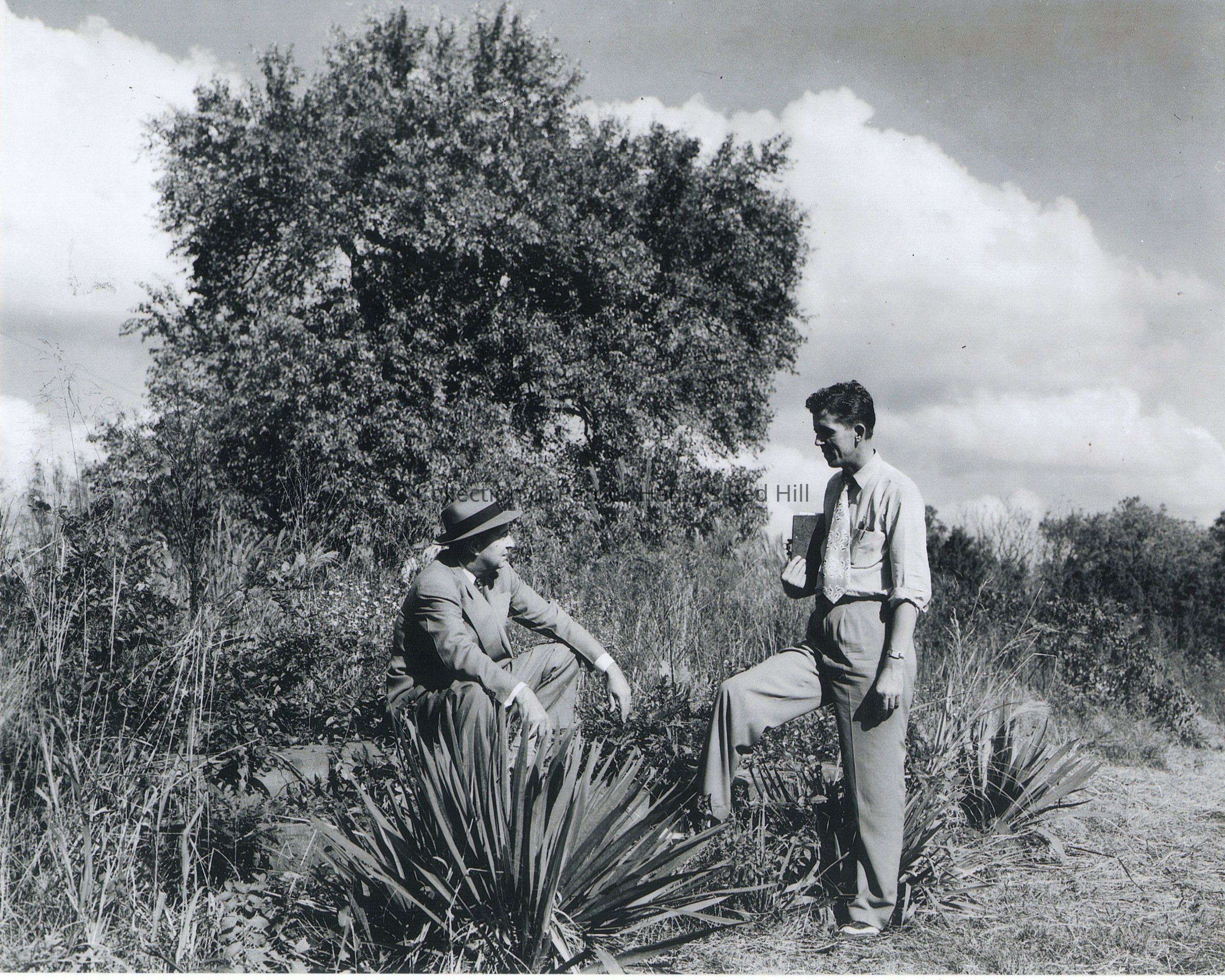 The photograph depicts Soil Conservation Service Regional Director Dr. Thomas Stephen Buie (1896–1973) speaking with O. Lynn Shelton, editor of the Halifax Gazette, known today as the Gazette-Virginian since 1963. They are sitting on the steps of what was the Henry mansion. The Osage orange tree stands in the background. Dr. Buie was one of the speakers during "Miracle Day", remarking the importance of the Boys' Plantation.