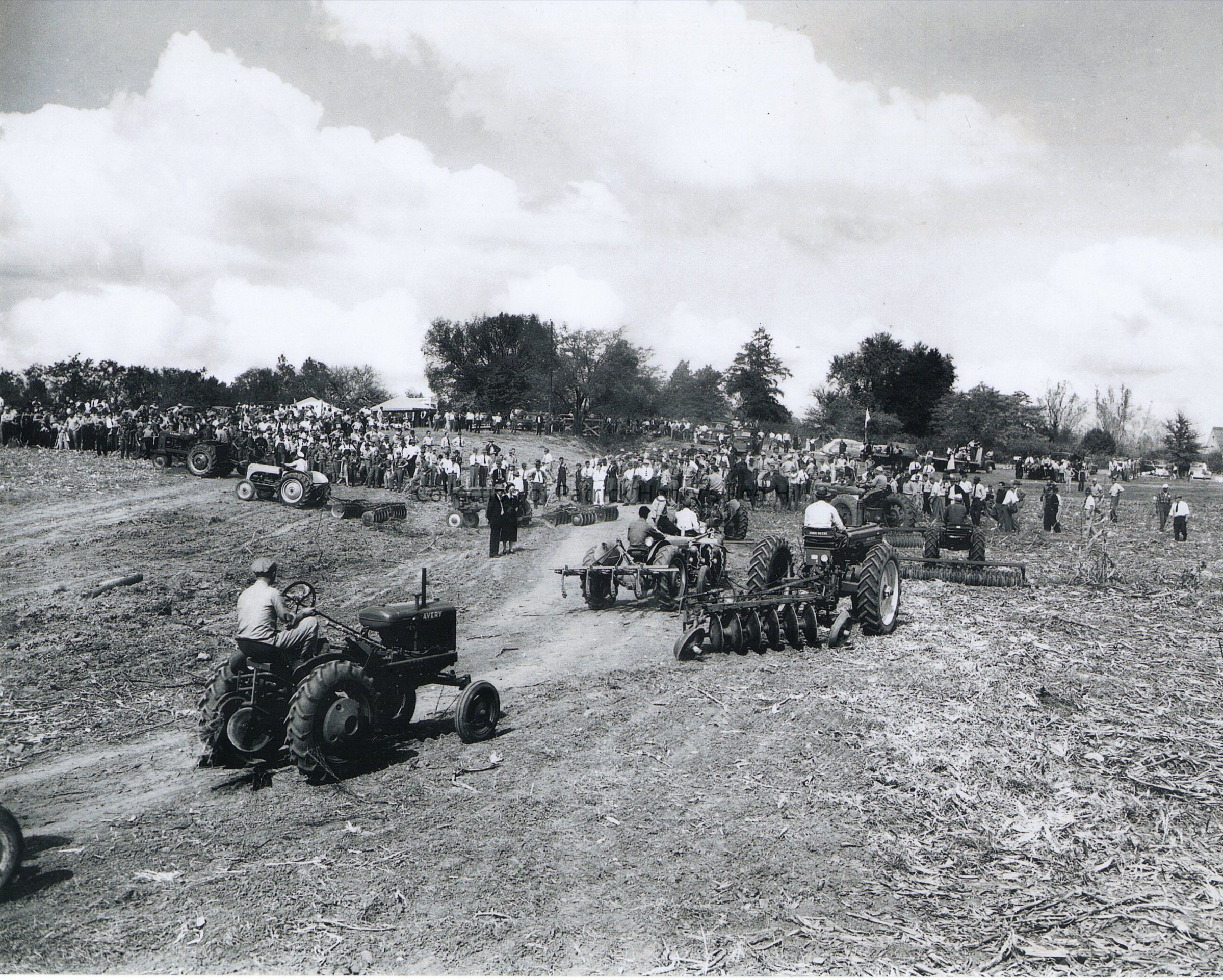 This photograph was taken right after a fog had lifted in the morning and as the men rolled their tractors out into the field between the railroad and the original house site.