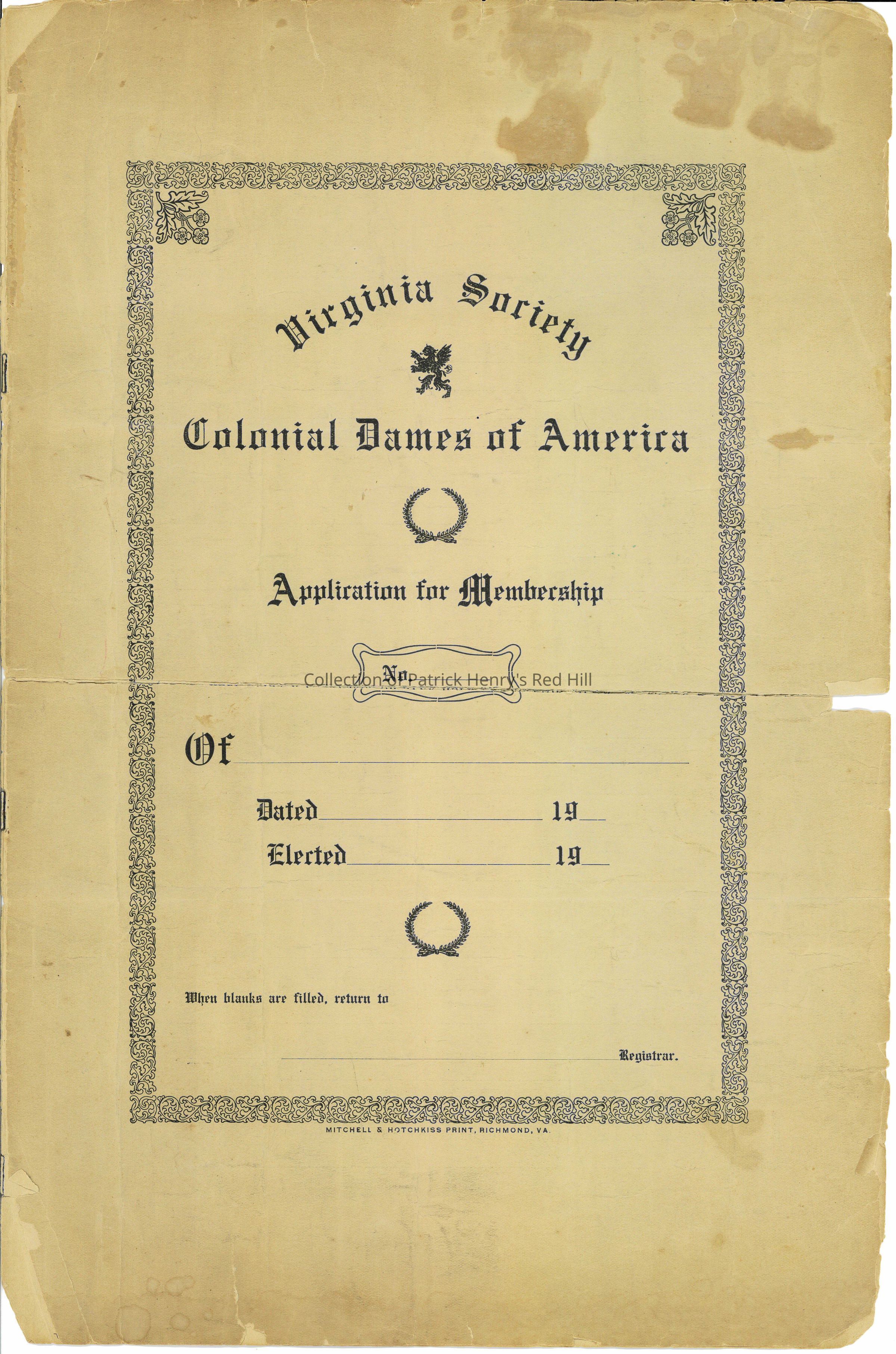 This membership application for the Virginia Society Colonial Dames of America was created and submitted by Virginia Creighton Borum Hickerson (1891–1950), a 3rd and 4th great-granddaughter of Patrick Henry, in 1916. Dr. Hickerson is descended from Henry through both his daughters, Elizabeth Aylett (1769–1842) and Martha Fontaine (1755–1818).