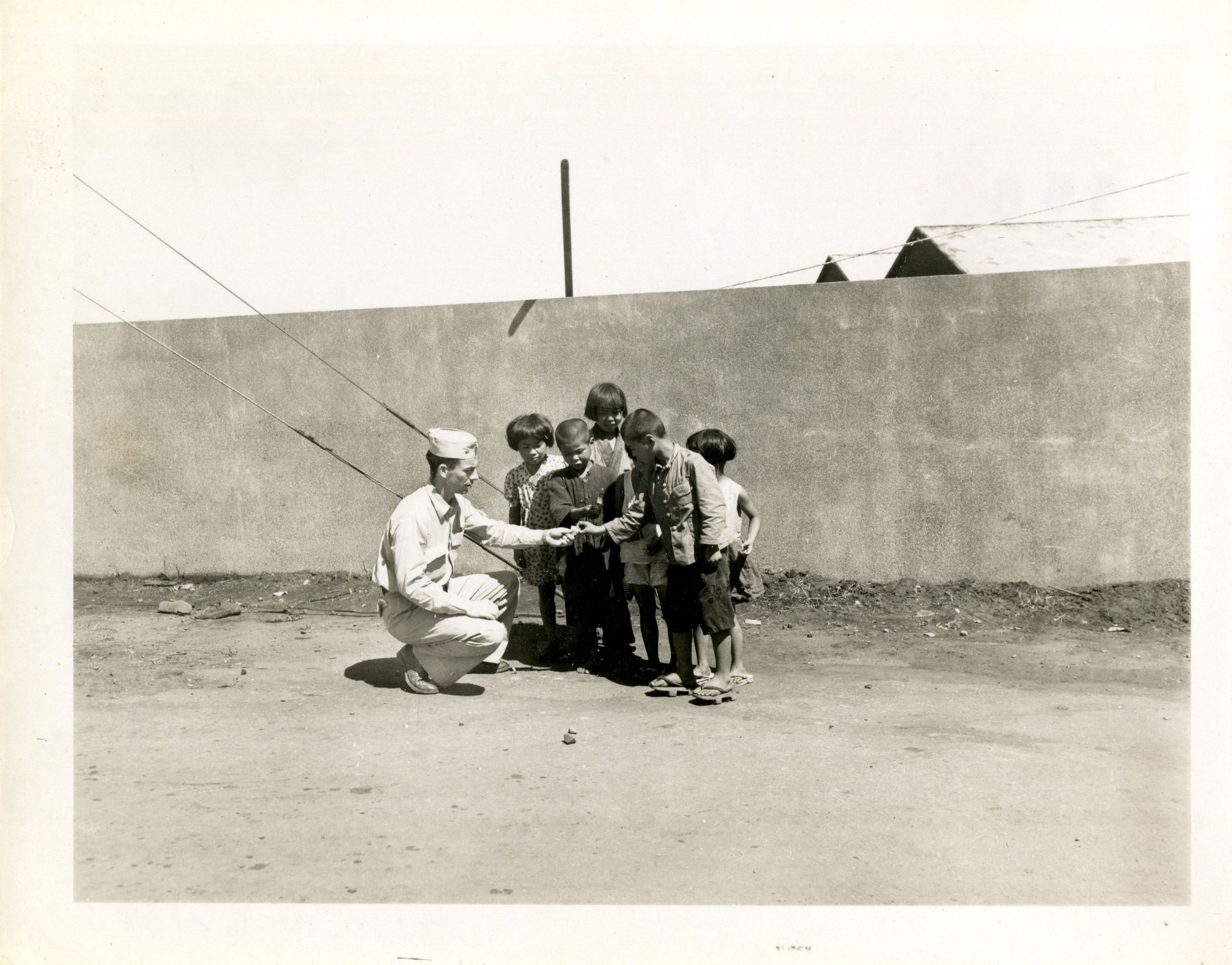 A postwar photo of Irven Klug giving candy to a group of Japanese children.Context