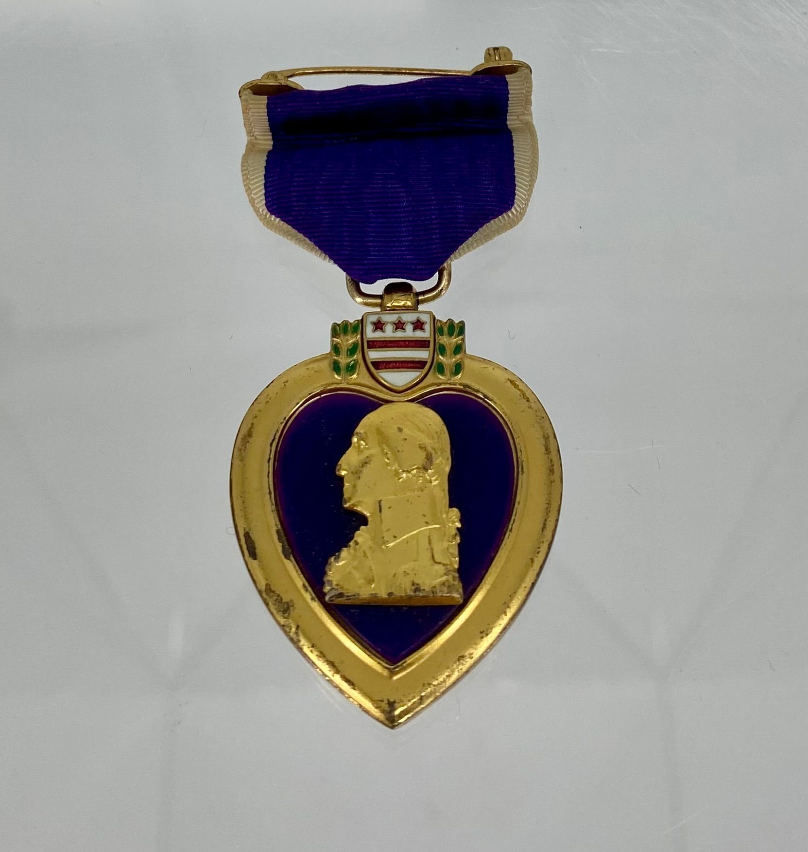 A purple and gold heart-shaped medal with the likeness of George Washington on the front. The back of the Purple Heart reads "For Military Merit," and the medal hangs from a purple and white ribbon.Use