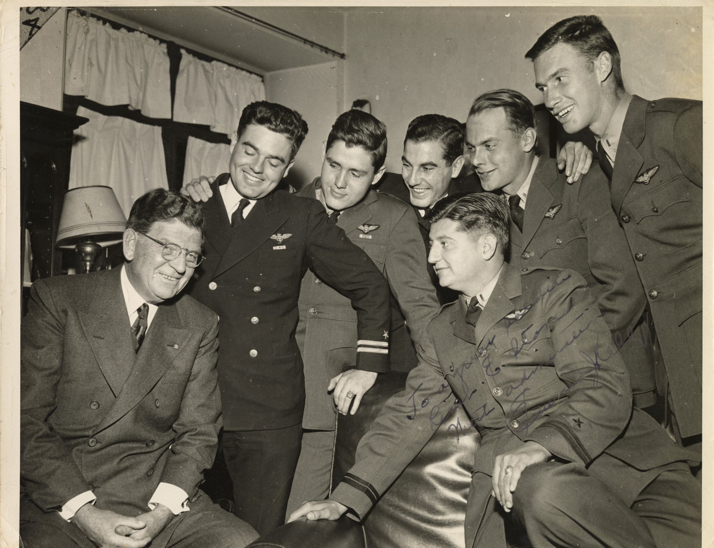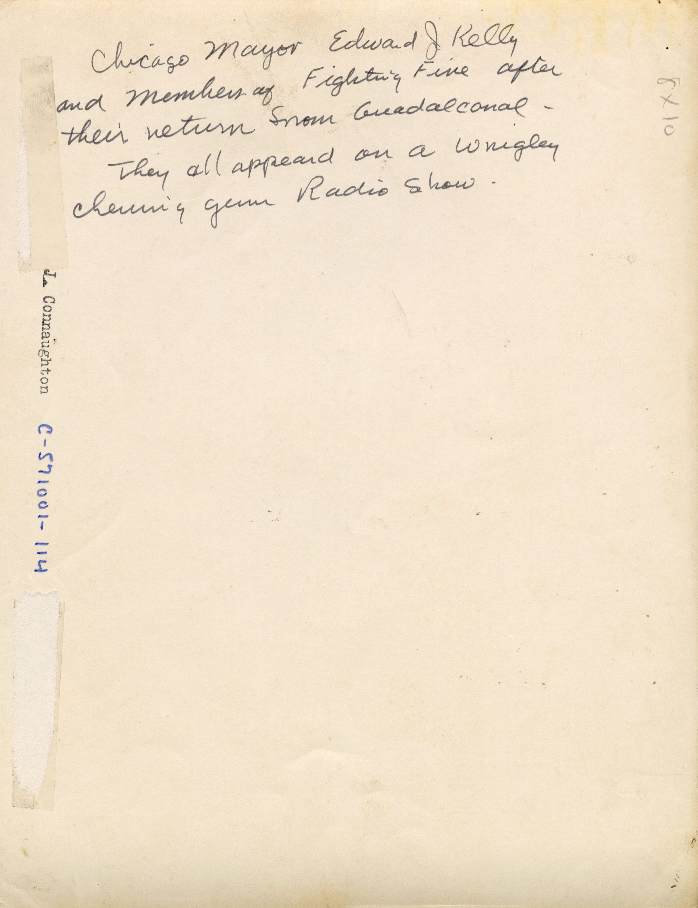 This photograph shows some of the members of Fighting Squadron Five with Chicago Mayor Edward Kelly. Following their successes in Guadalcanal, members of Fighting Squadron Five would appear on a radio show along with Mayor Kelly.Context