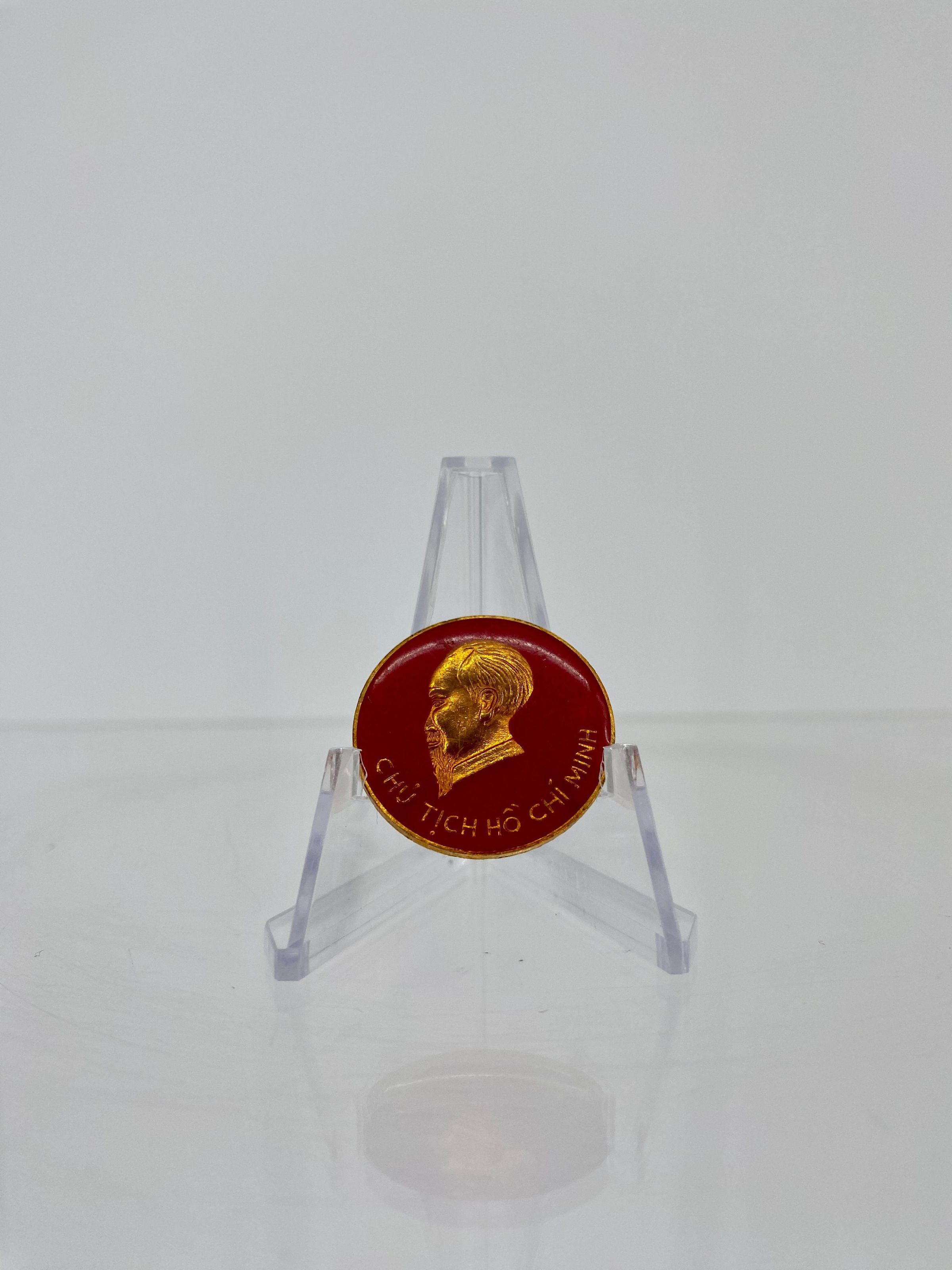 A thin, circular badge with a side-profile of Ho Chi Minh and the word 'chủ tịch hồ chí minh' in gold foil. 'Chủ tịch hồ chí minh' translates as 'President Ho Chi Minh.'Use