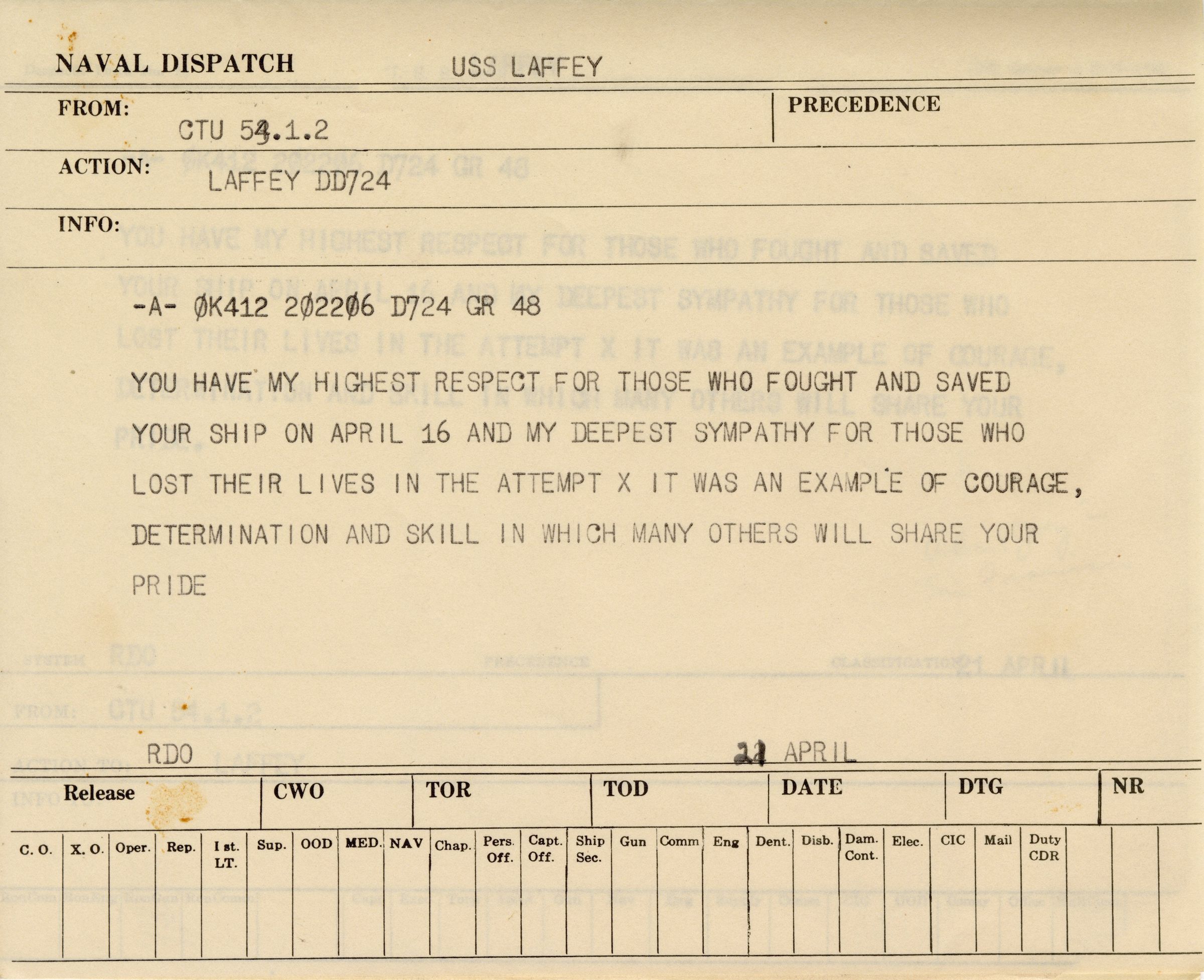 In this message, Admiral Charles Joy of Commander Task Unit (CTU) 54.1.2 expresses his respect and admiration for the actions of the crew of the USS Laffey (DD-724) for their defense of the ship.Collection