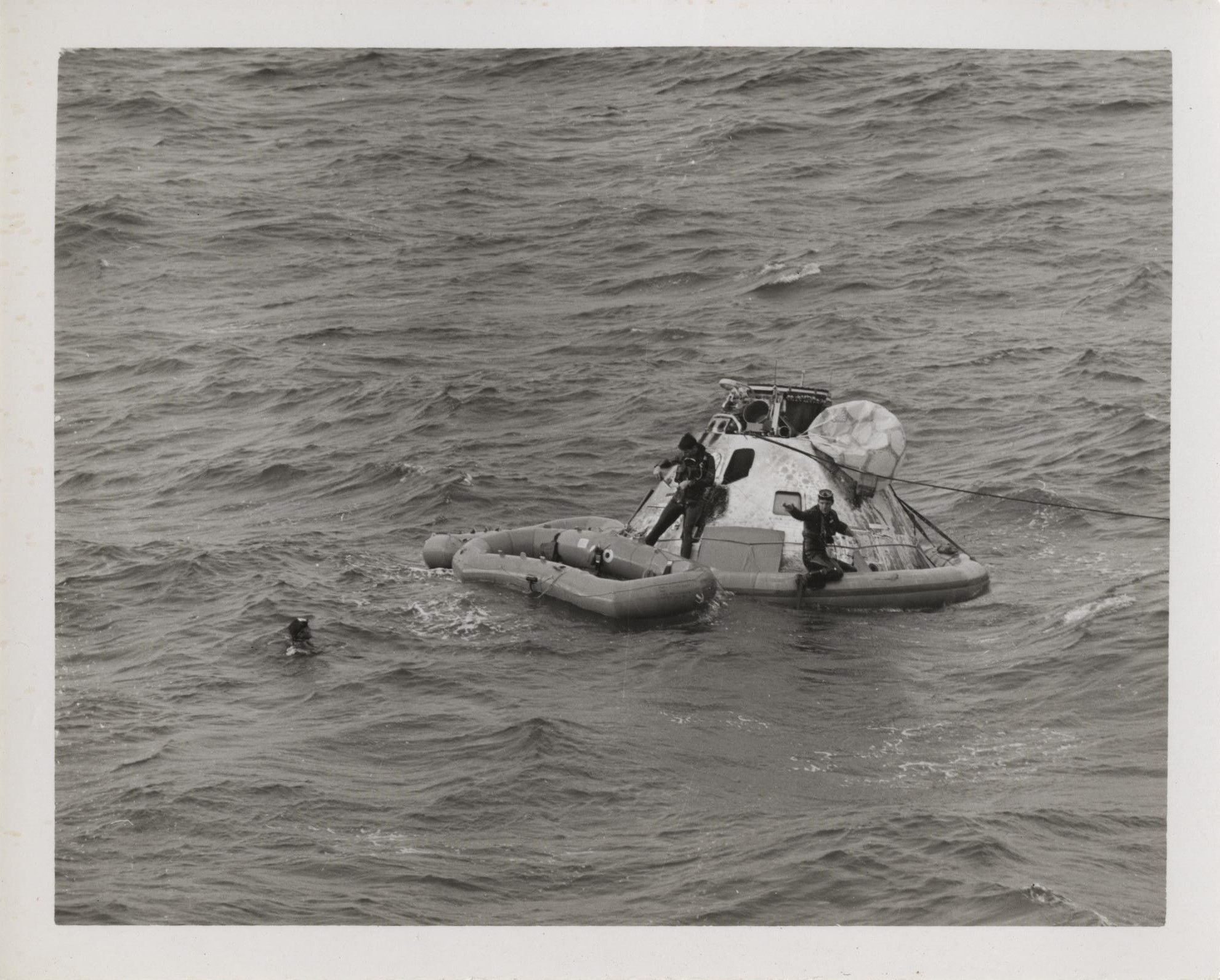 Photograph of the Apollo 8 capsule with Navy Frogmen (Underwater Demolition Team) onboard as they work to stabilize the capsule and recover the crew to the USS Yorktown (CVS-10).Context