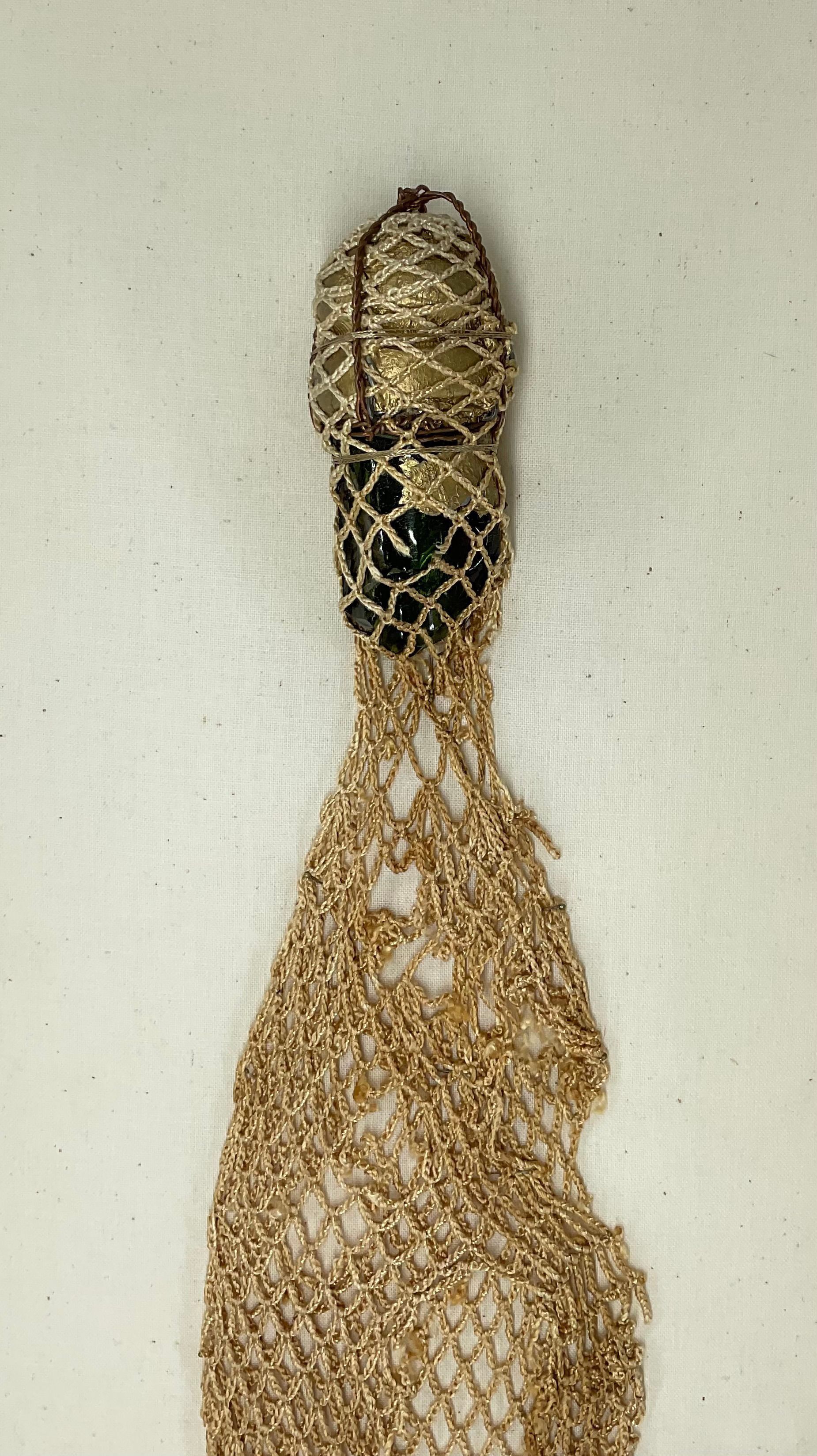 Cork and glass neck fragments from the champagne bottle used for christening the USS Yorktown (CV-10). The netting surrounded the full bottle is still present.Use