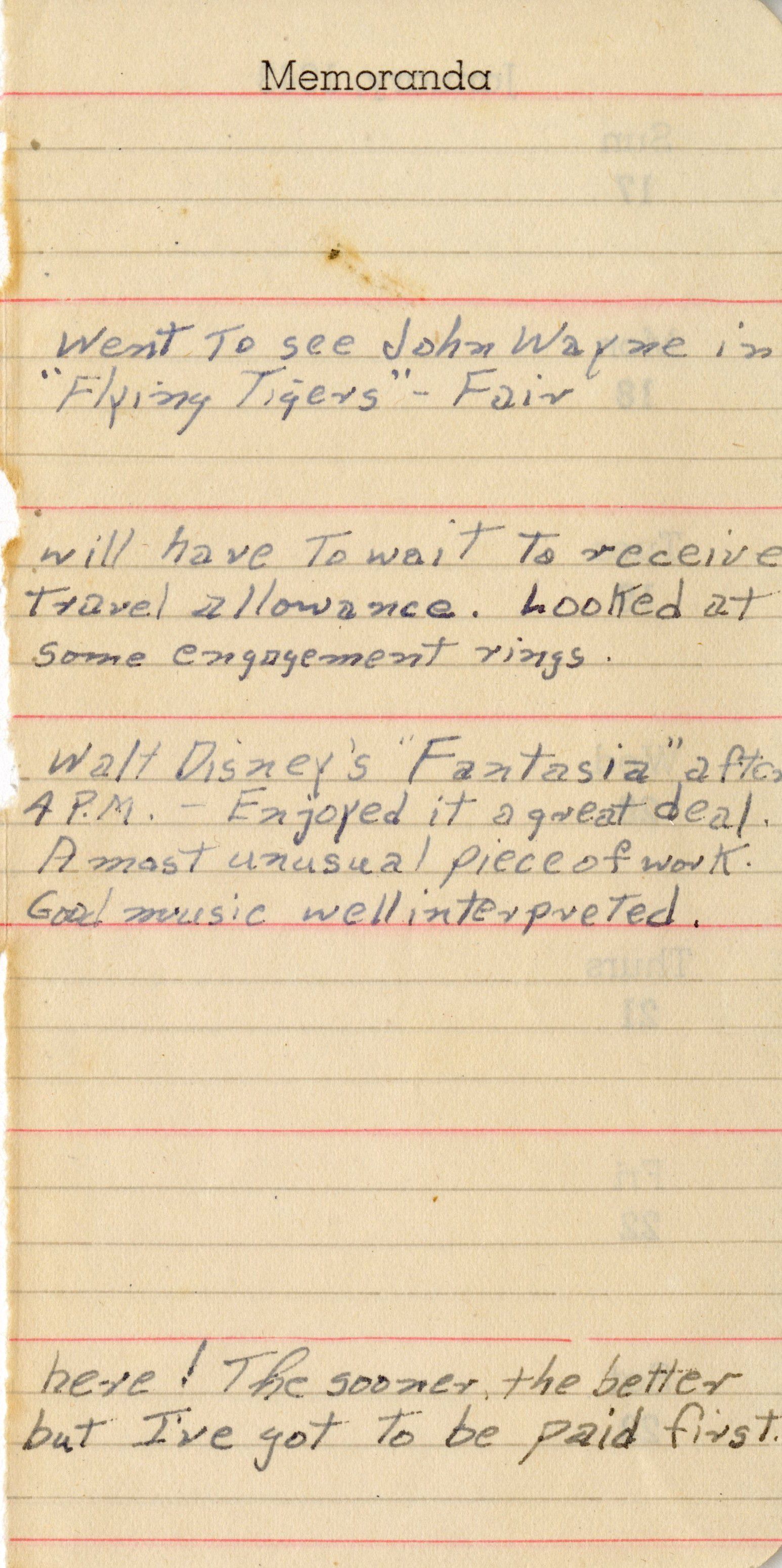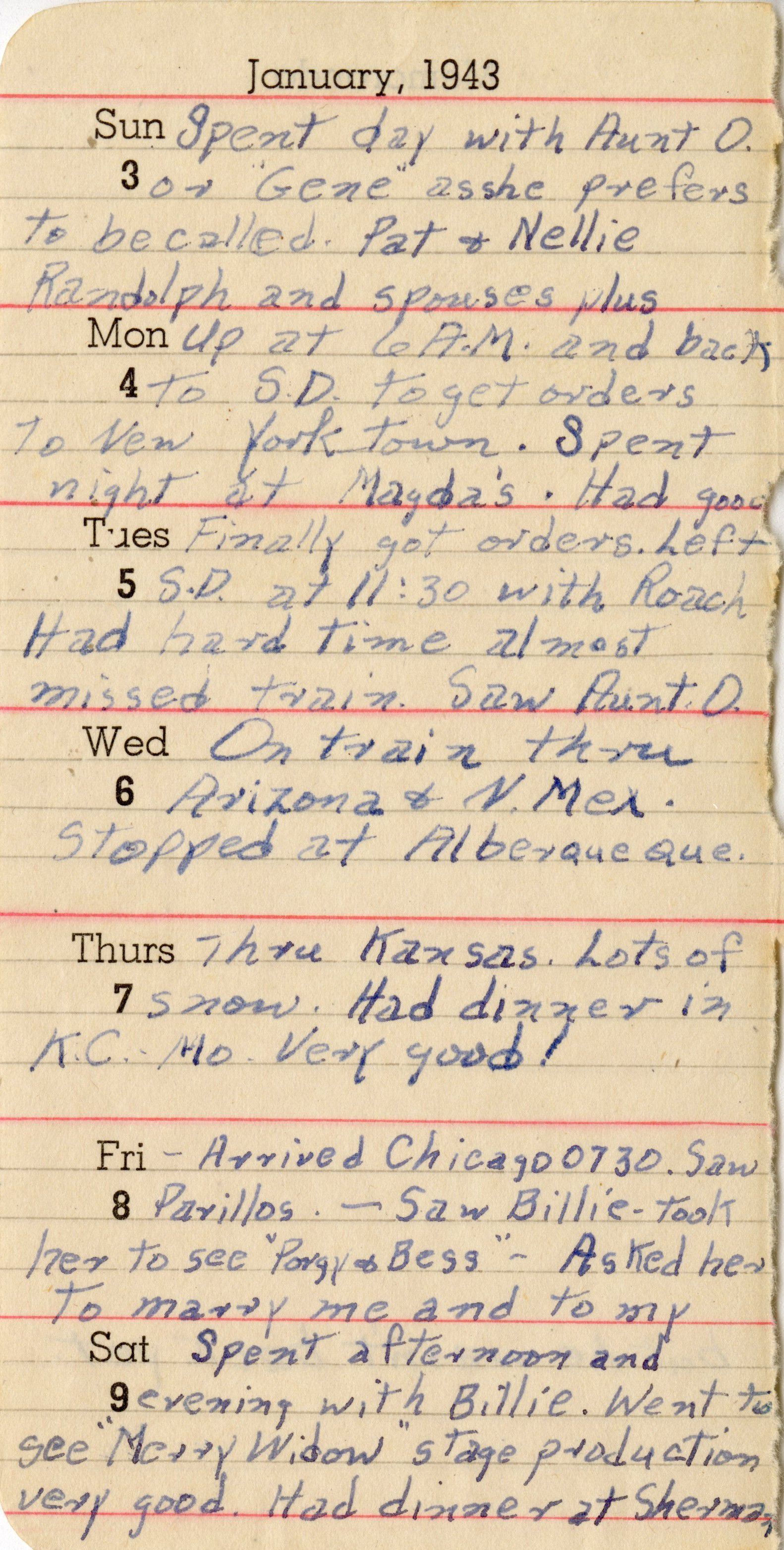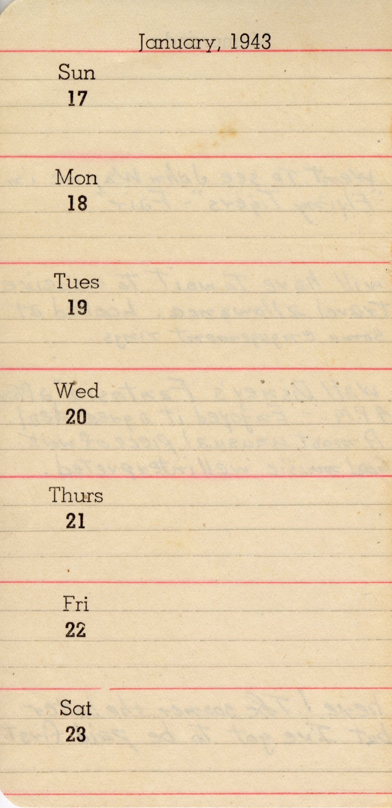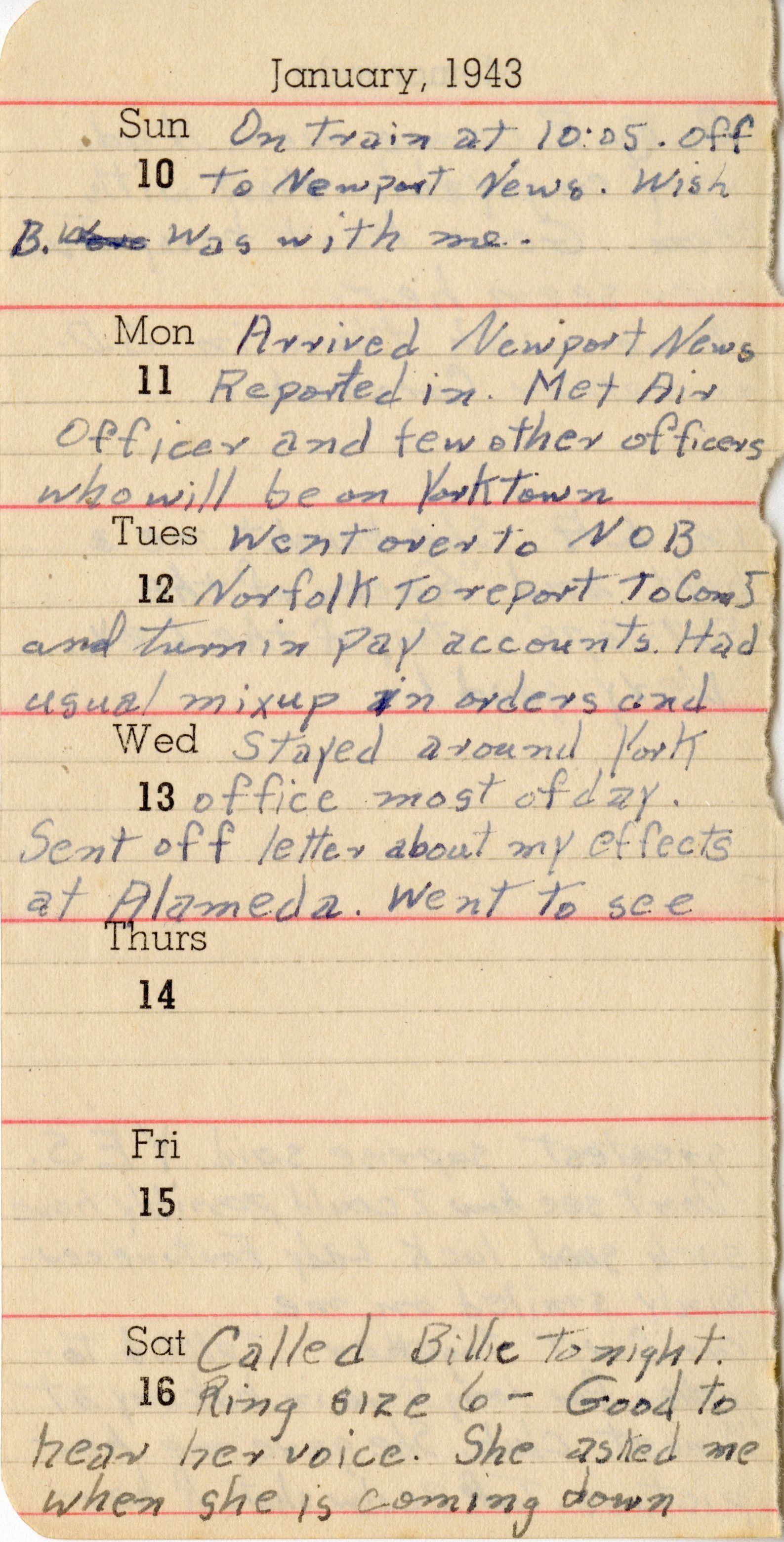 These daily notes were made by Elisha "Smokey" Stover and cover the first half of January 1943. The notes cover the time period in which Elisha "Smokey" Stover was first assigned to the USS Yorktown (CV-10).Context