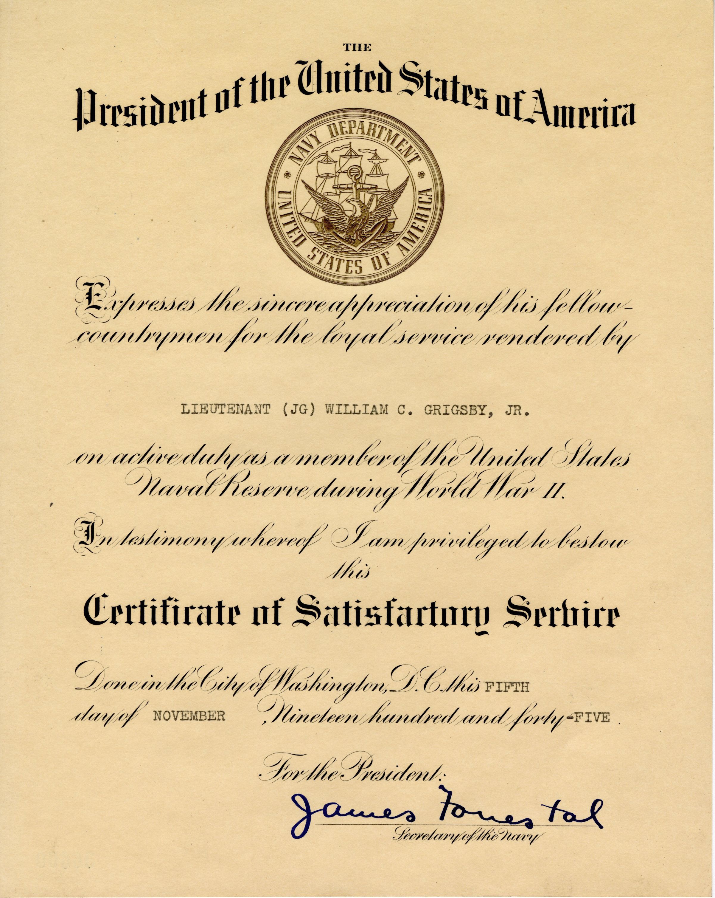 This certificate shows that William Grigsby, Jr. served in the United States Naval Reserve during World War II and is signed by Secretary of the Navy James Forrestal.Context
