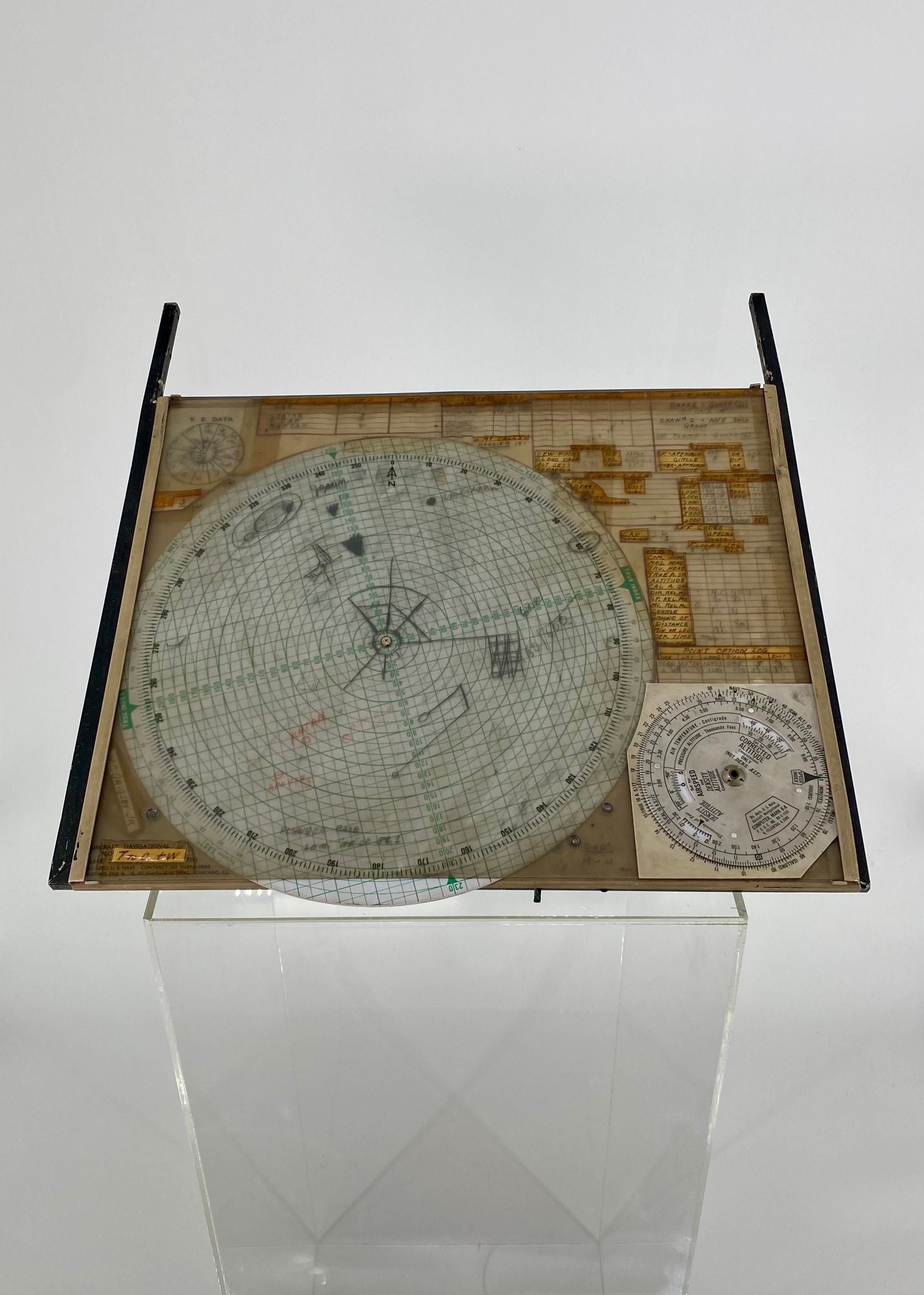 Issued to naval pilots as integral navigation equipment. The metal frame allows the board to be mounted in the plane for ease of navigation and stability. The inserted navigational charts allow the plexiglass top to be used as a reusable writing surface.Context