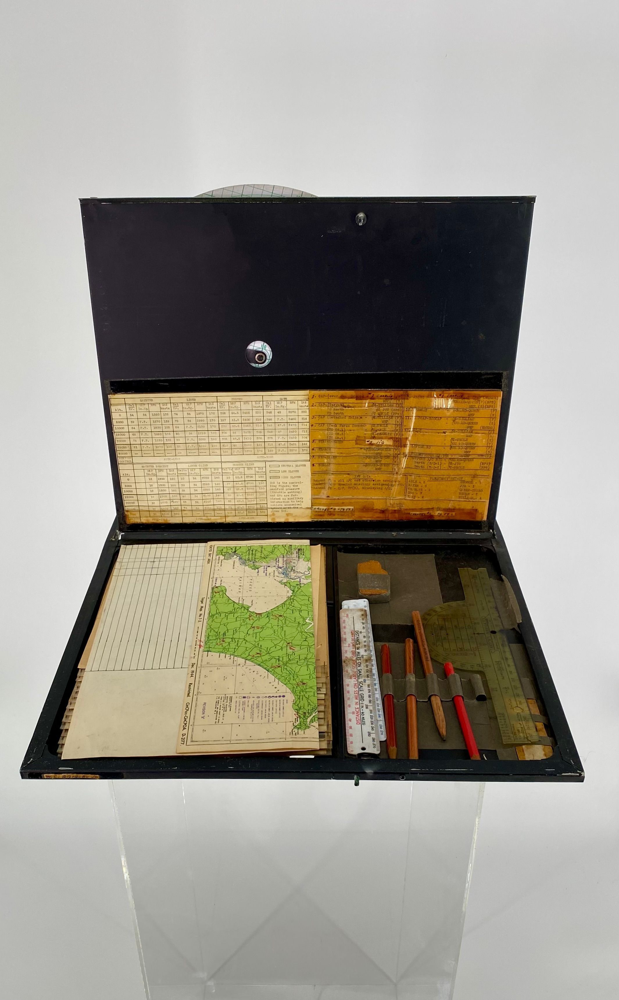Large, plexiglass and metal-framed aviator's navigation board. The top of the board is a see-through plexiglass sheet with an attached Mark 8-A analog computer and true index dials. Inserted underneath the plexiglass sheet are hand-written navigational charts. The plexiglass top flips open to a storage compartment. Inside the lid are taped charts. In the compartment are tools such as pencils, rulers, and charts.Use
