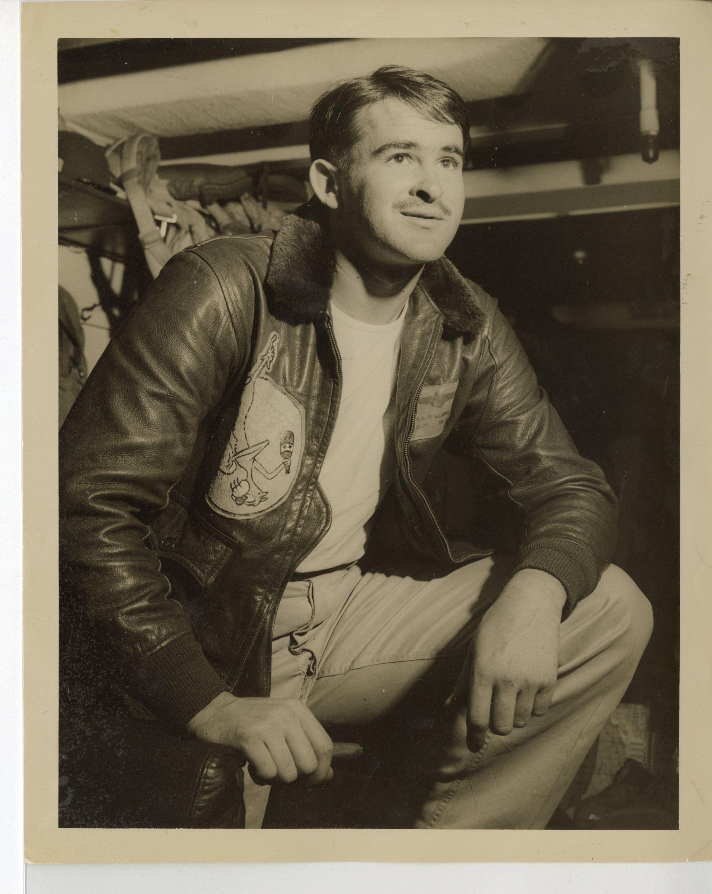 A posed, black and white photo of Eugene "Gene" Valencia of Fighting Squadron Nine (VF-9) wearing his leather flight jacket in the Ready Room of the USS Yorktown (CV-10). Valencia was the US Navy's third highest scoring Ace of World War II with 23 kills and the leader of a unit of four pilots nicknamed "Valencia's Flying Circus." No slouches either, the Flying Circus was credited with 50 confirmed air victories by war’s end.Context
