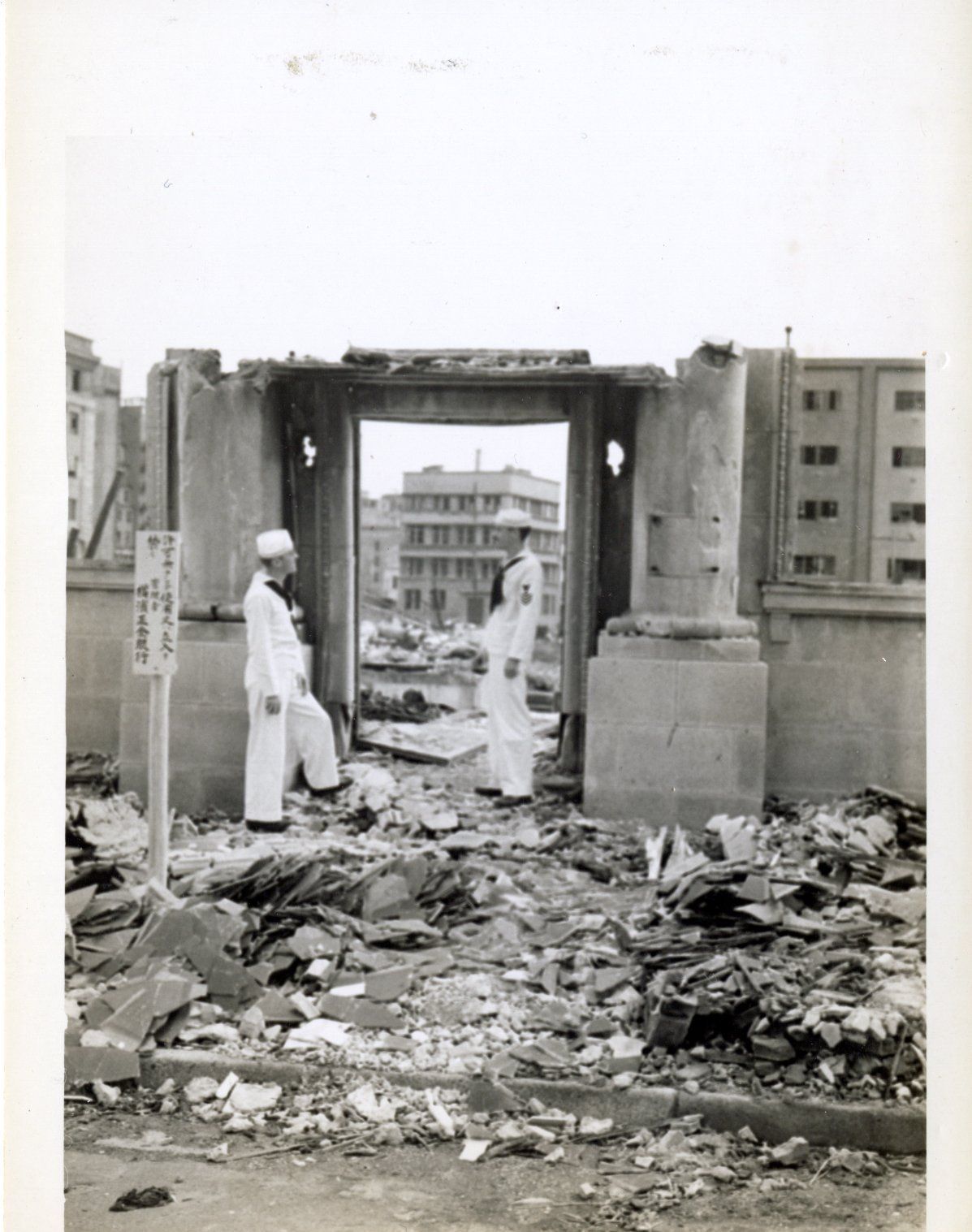 A black and white photograph of two American sailors standing in the doorway of a destroyed building in Tokyo. The photo is from an album containing 53 photographs taken by Warren Tucker and his friends during the USS Yorktown (CV-10) crew liberty in Tokyo, Japan in September of 1945.